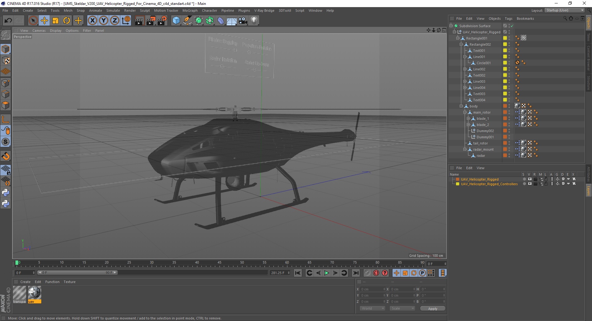 UMS Skeldar V200 UAV Helicopter Rigged for Cinema 4D is fully rigged and is ready to be animated in Cinema 4D. You can easily position it the way you need or animate it the way your project requires. See the screenshots to get an idea of how rigging works. The pose of the model on the render images is an example and can be recreated using rig, it is not initially included into the product.