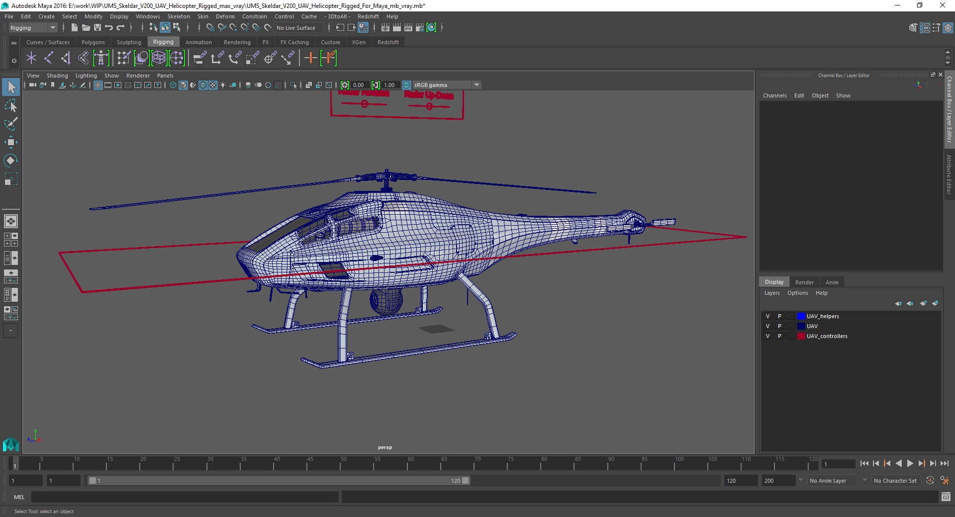 UMS Skeldar V200 UAV Helicopter Rigged for Maya is fully rigged and is ready to be animated in Maya. You can easily position it the way you need or animate it the way your project requires. See the screenshots to get an idea of how rigging works. The pose of the model on the render images is an example and can be recreated using rig, it is not initially included into the product.