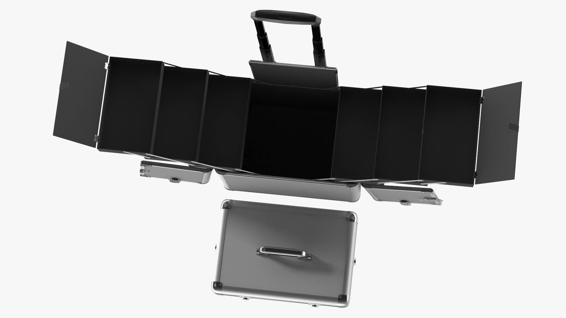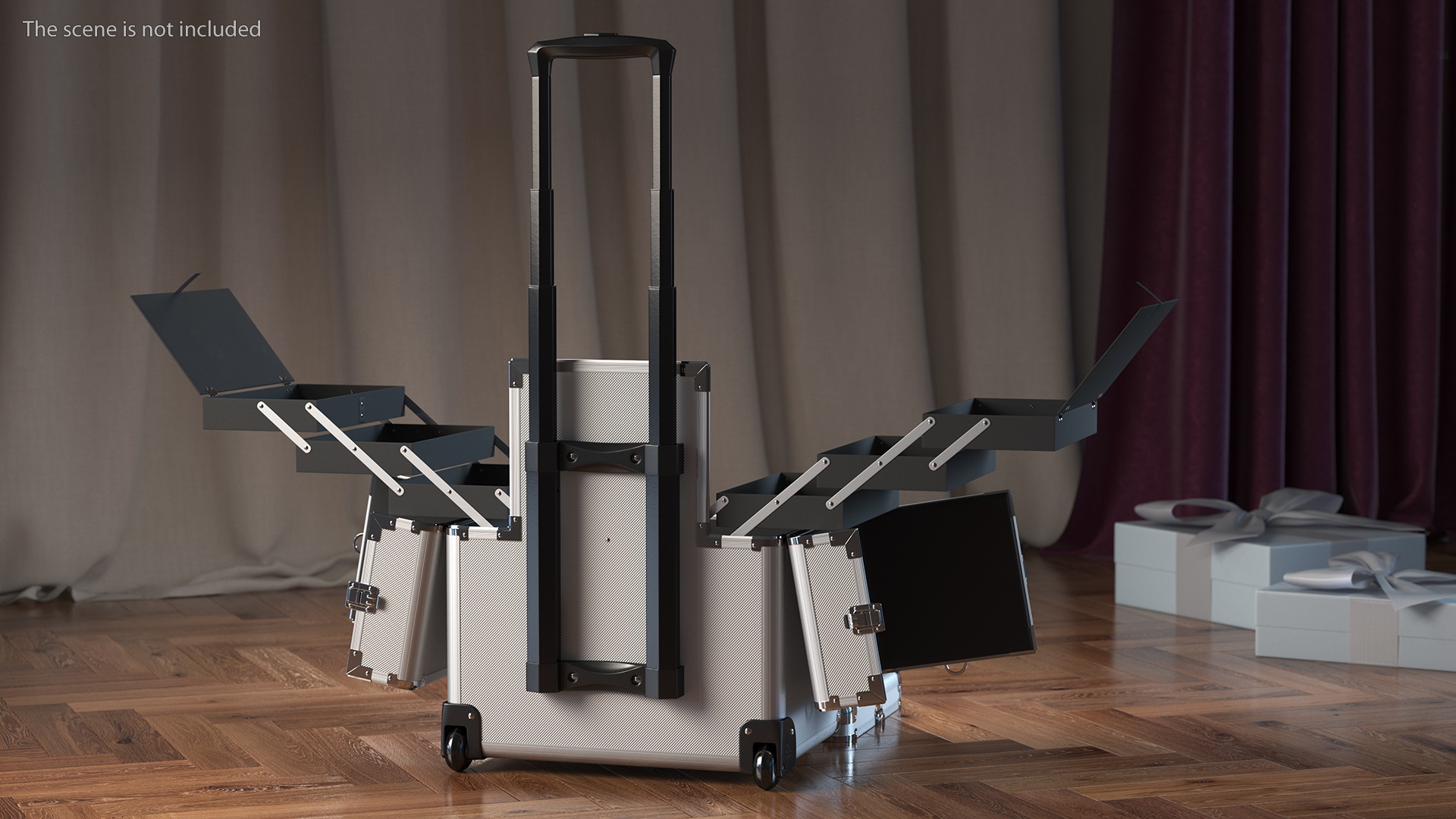 Unfolded Yaheetech Makeup Case Silver is a three-dimensional model of a professional, foldable and lockable trolley-shaped cosmetic case with wheels (rollings).