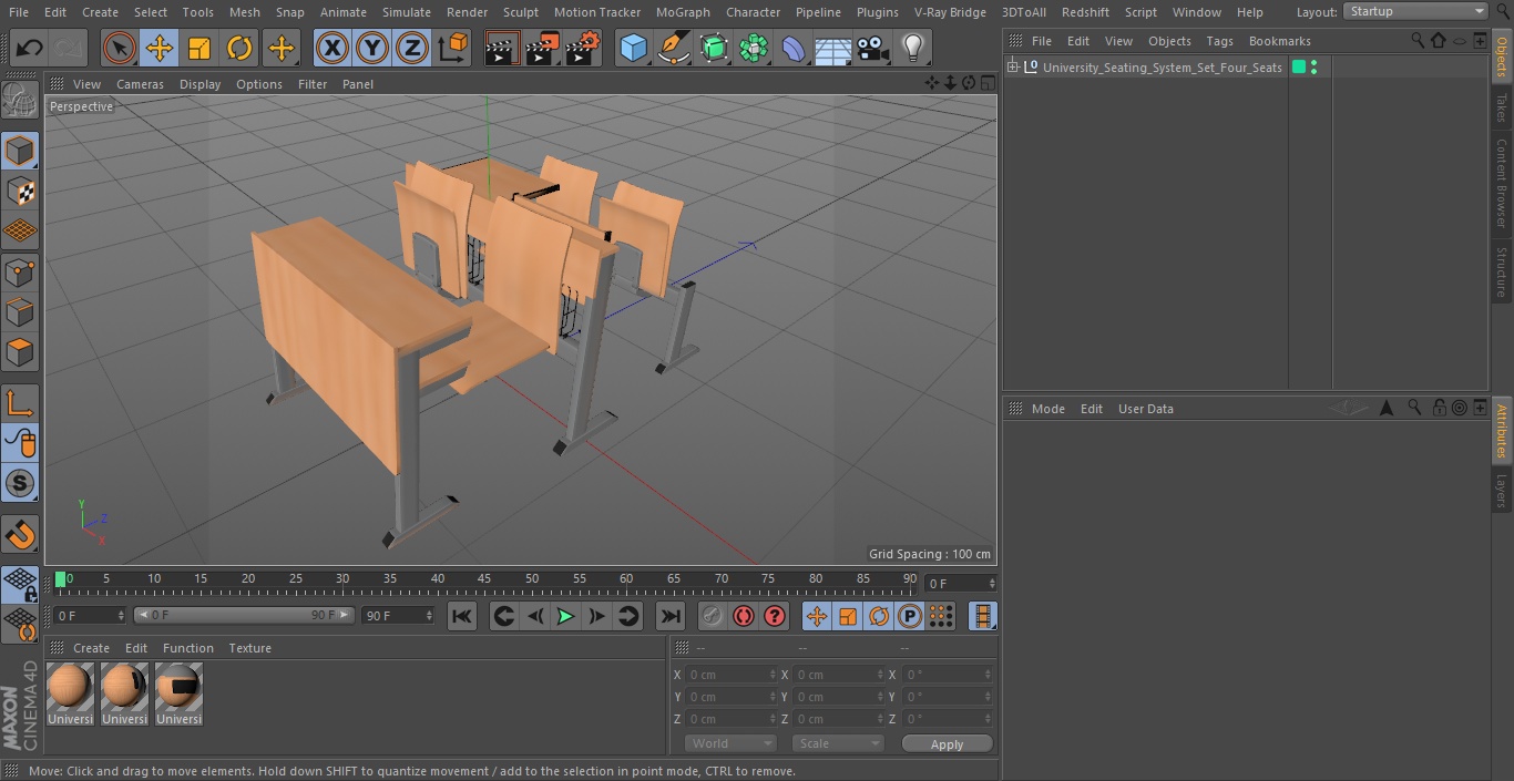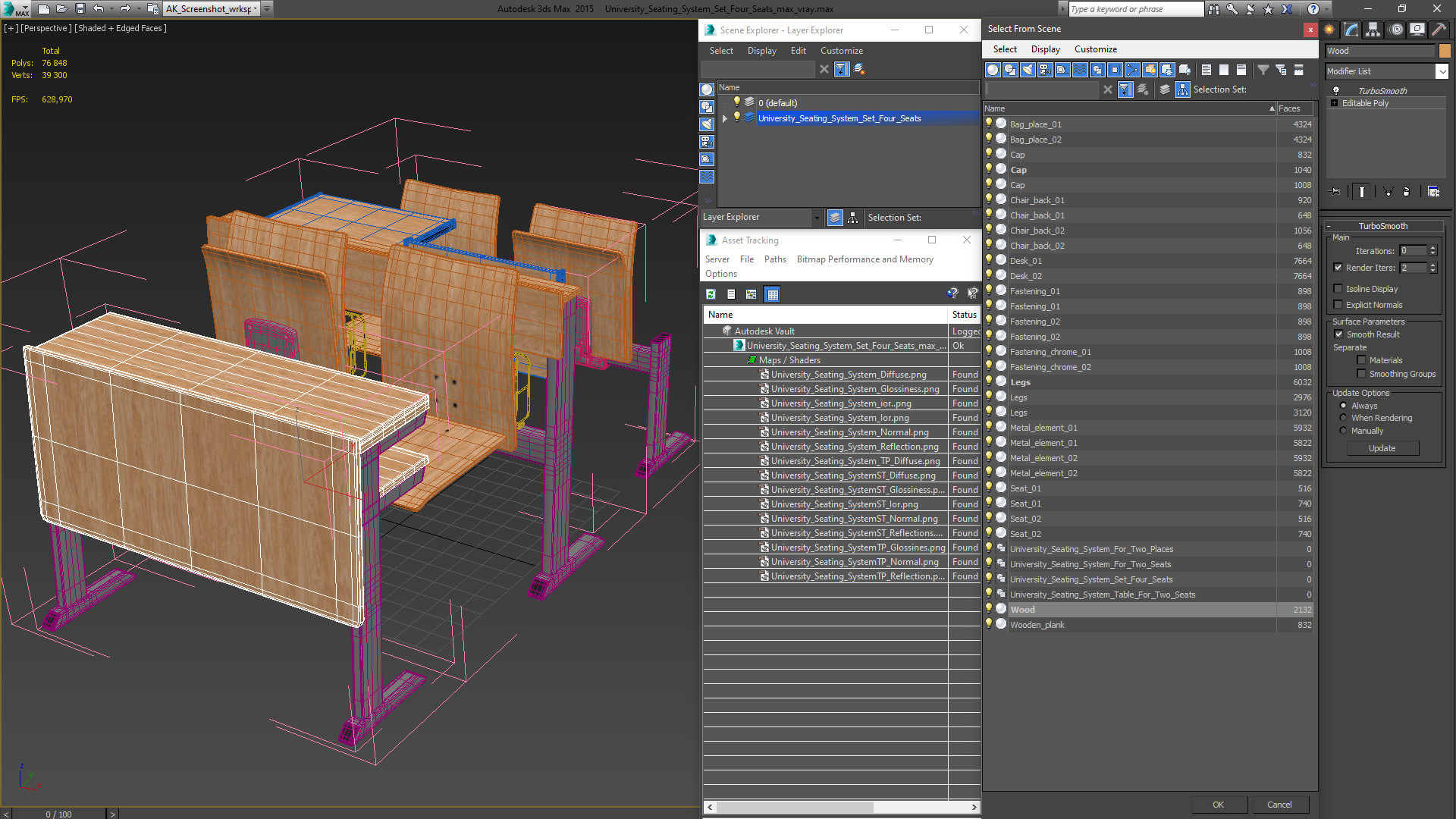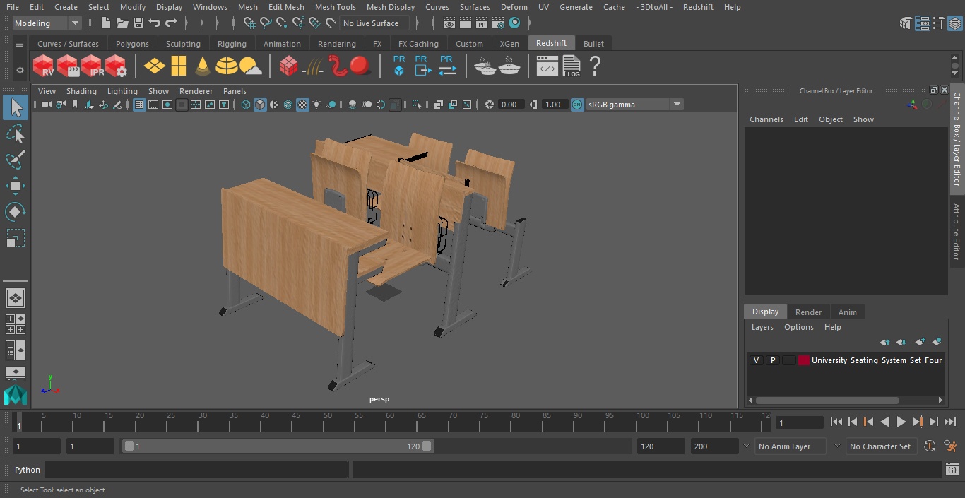 University Seating System Set Four Seats is a high quality, photo real 3d model that will enhance detail and realism to any of your rendering projects. The model has a fully textured, detailed design that allows for close-up renders, and was originally modeled in 3ds Max 2020 and rendered with V-Ray. Renders have no postprocessing!