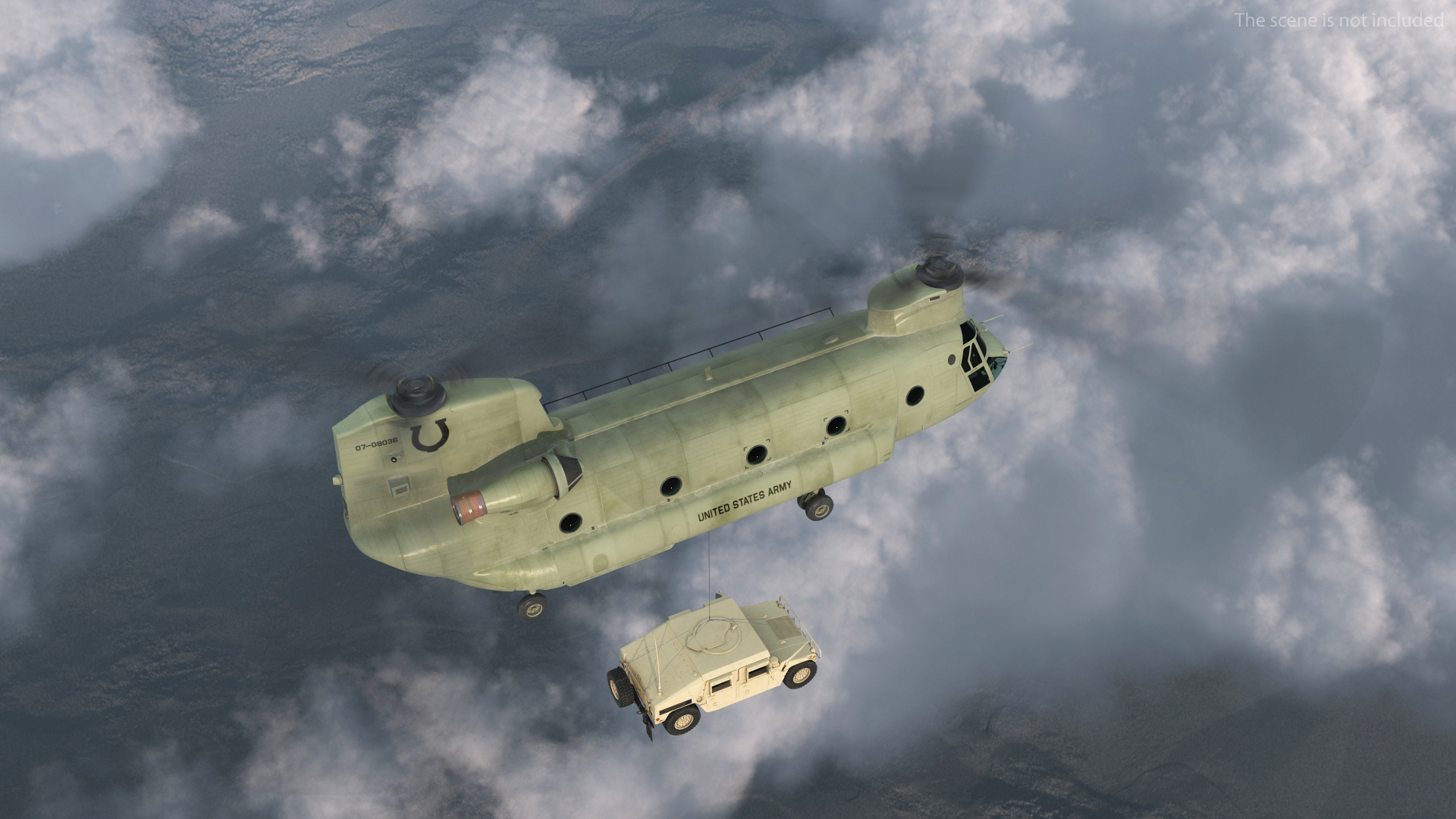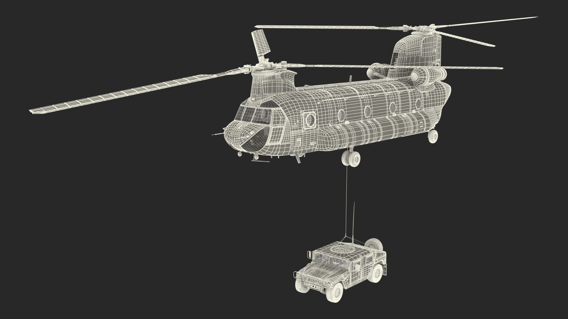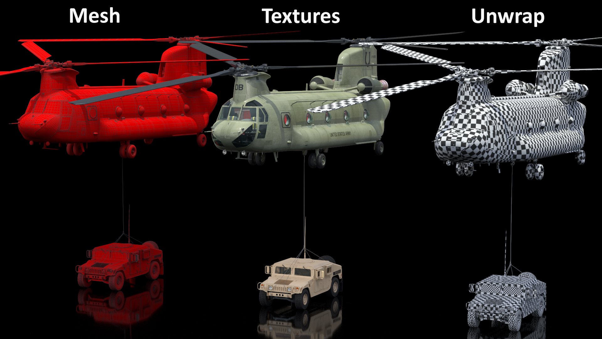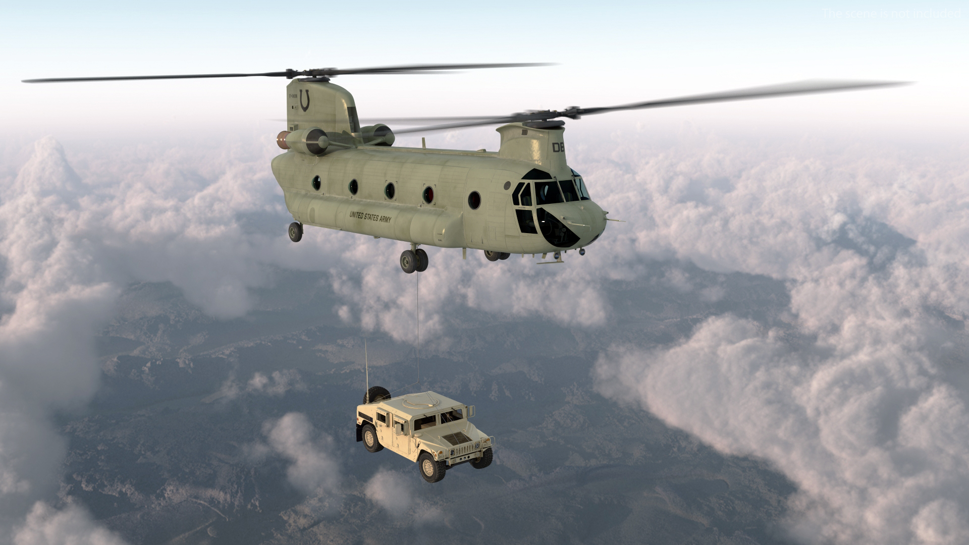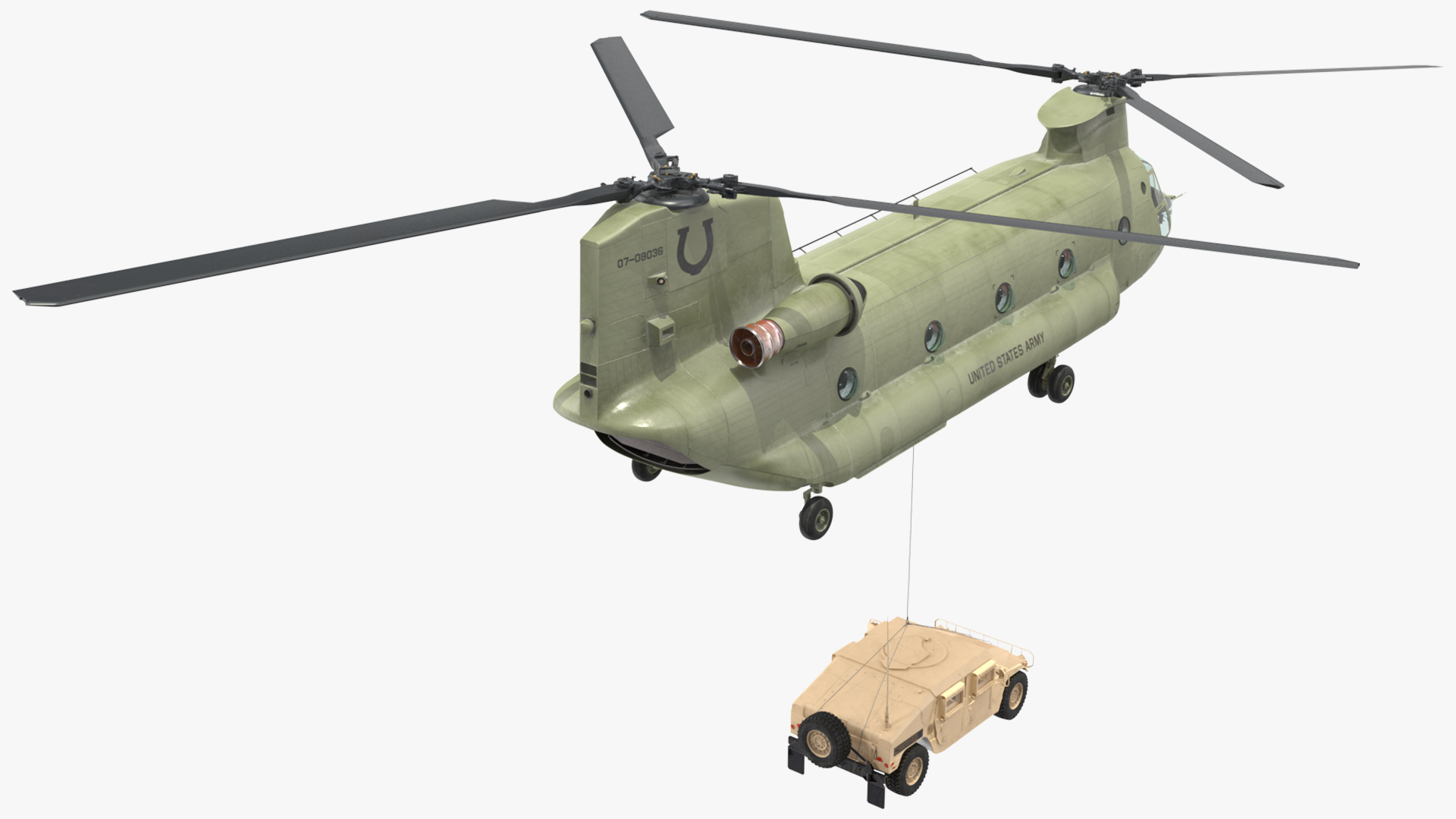 US Army Transport Helicopter With Humvee M1151 is a 3d model of tandem rotor helicopter carrying Humvee M1151 - a ground vehicle with armored turret on its roof. M1151 primary role is to carry a squad of troops into battle and provide them with fire support. It can also be used to shoot down enemy aircraft, as it does a fairly good amount of damage for its size. Transport helicopters equipped with three external ventral cargo hooks to carry underslung loads or cargo. These helicopters can be armed but are not expected to attack targets unless absolutely necessary.