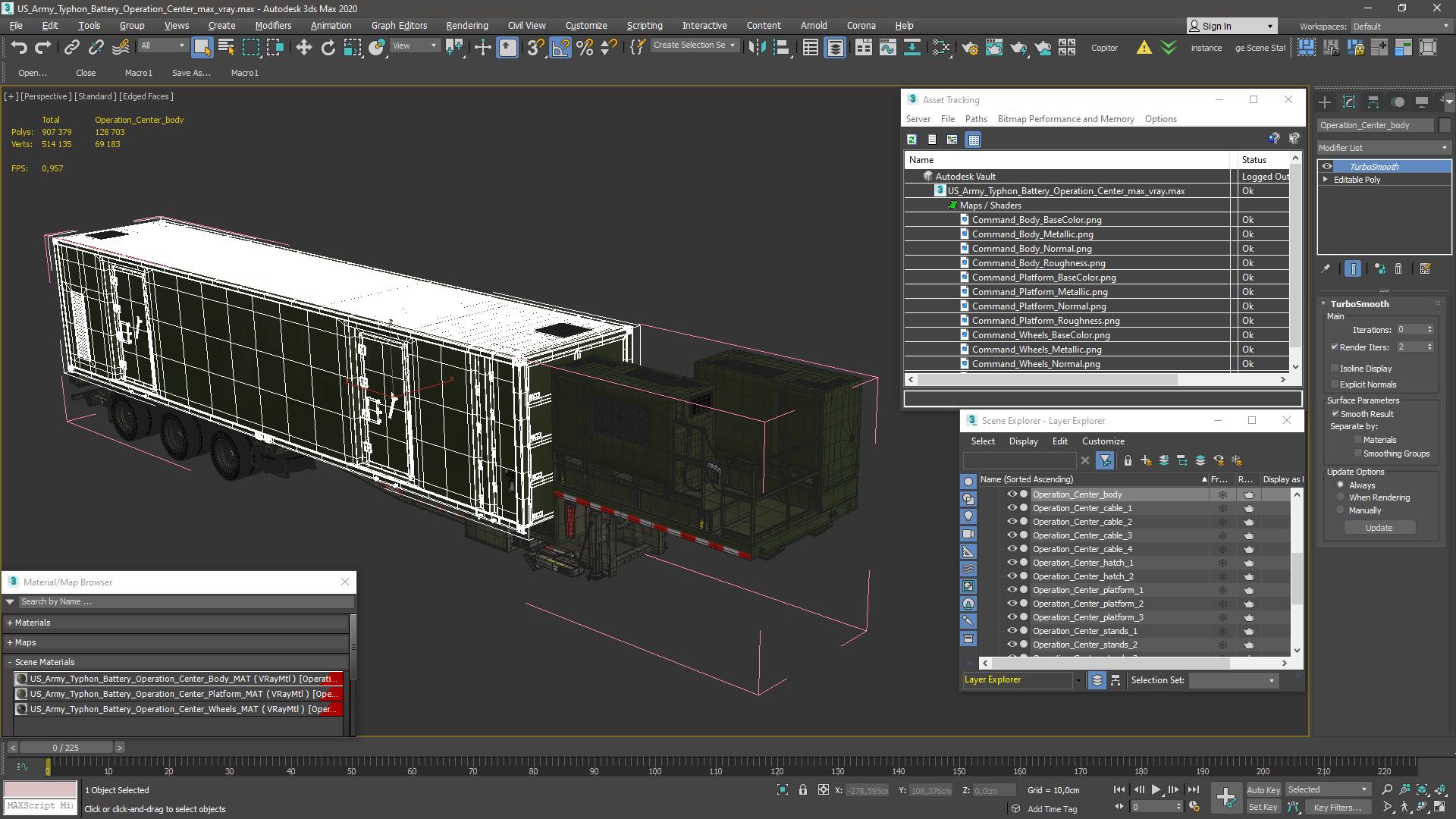 US Army Typhon Battery Operation Center is a high quality, photo real 3d model that will enhance detail and realism to any of your rendering projects. The model has a fully textured, detailed design that allows for close-up renders, and was originally modeled in 3ds Max 2020 and rendered with V-Ray. Renders have no postprocessing!