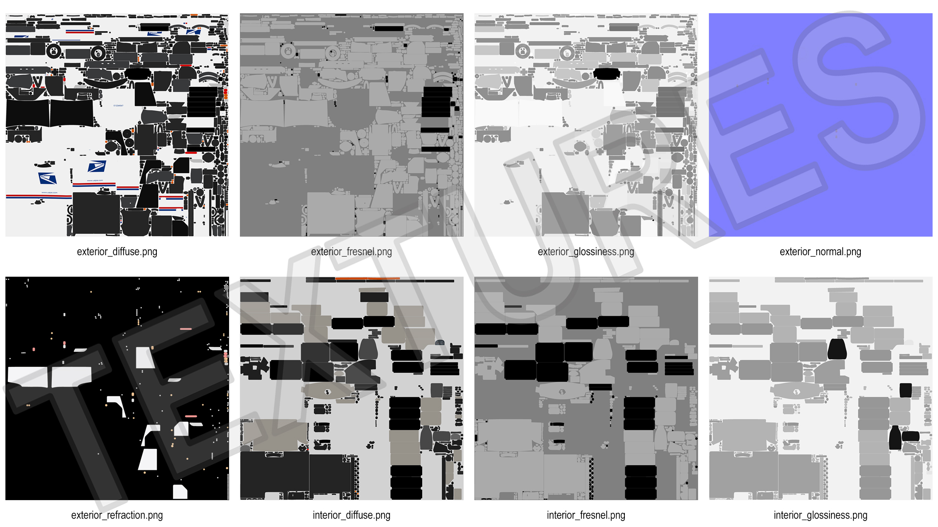 All textures and materials are included and mapped. (All colors can be easily modified.)