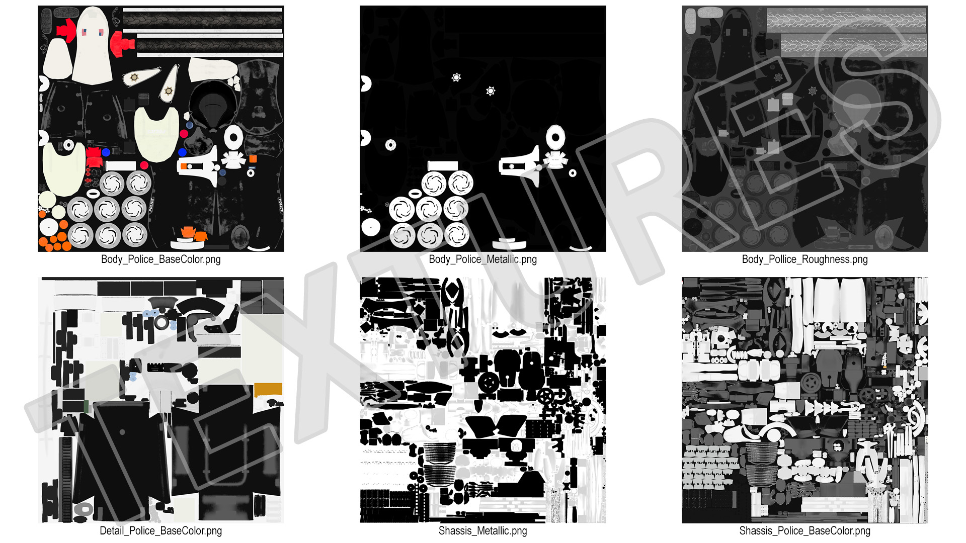 All textures and materials are included and mapped. (All colors can be easily modified.)