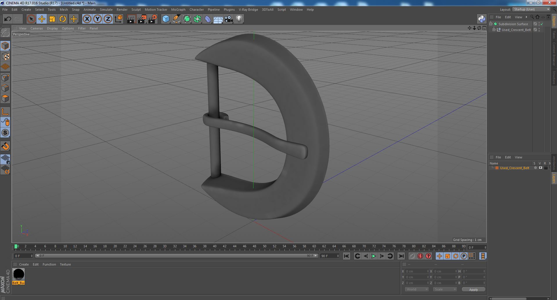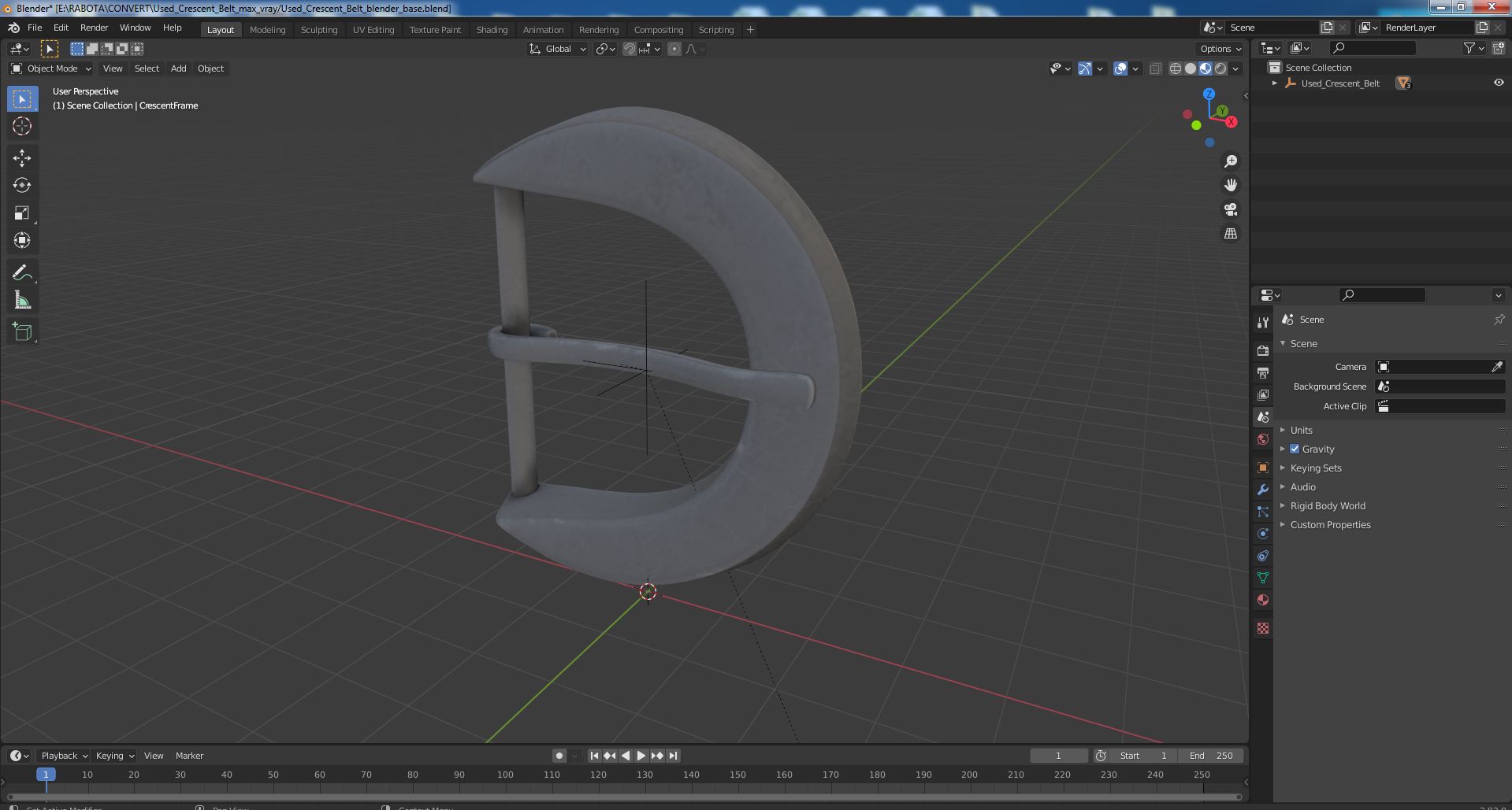 Used Crescent Belt is a high quality, photo real 3d model that will enhance detail and realism to any of your rendering projects. The model has a fully textured, detailed design that allows for close-up renders, and was originally modeled in 3ds Max 2020 and rendered with V-Ray. Renders have no postprocessing!