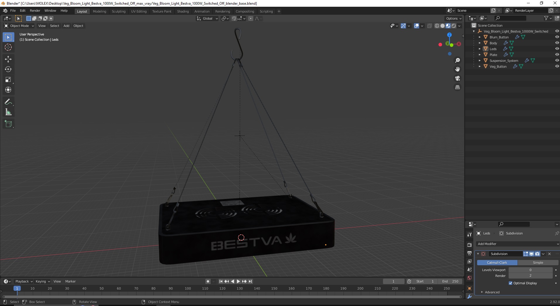Veg Bloom Light Bestva 1000W Switched Off is a high quality, photo real 3d model that will enhance detail and realism to any of your rendering projects. The model has a fully textured, detailed design that allows for close-up renders, and was originally modeled in 3ds Max 2020 and rendered with V-Ray. Renders have no postprocessing!
