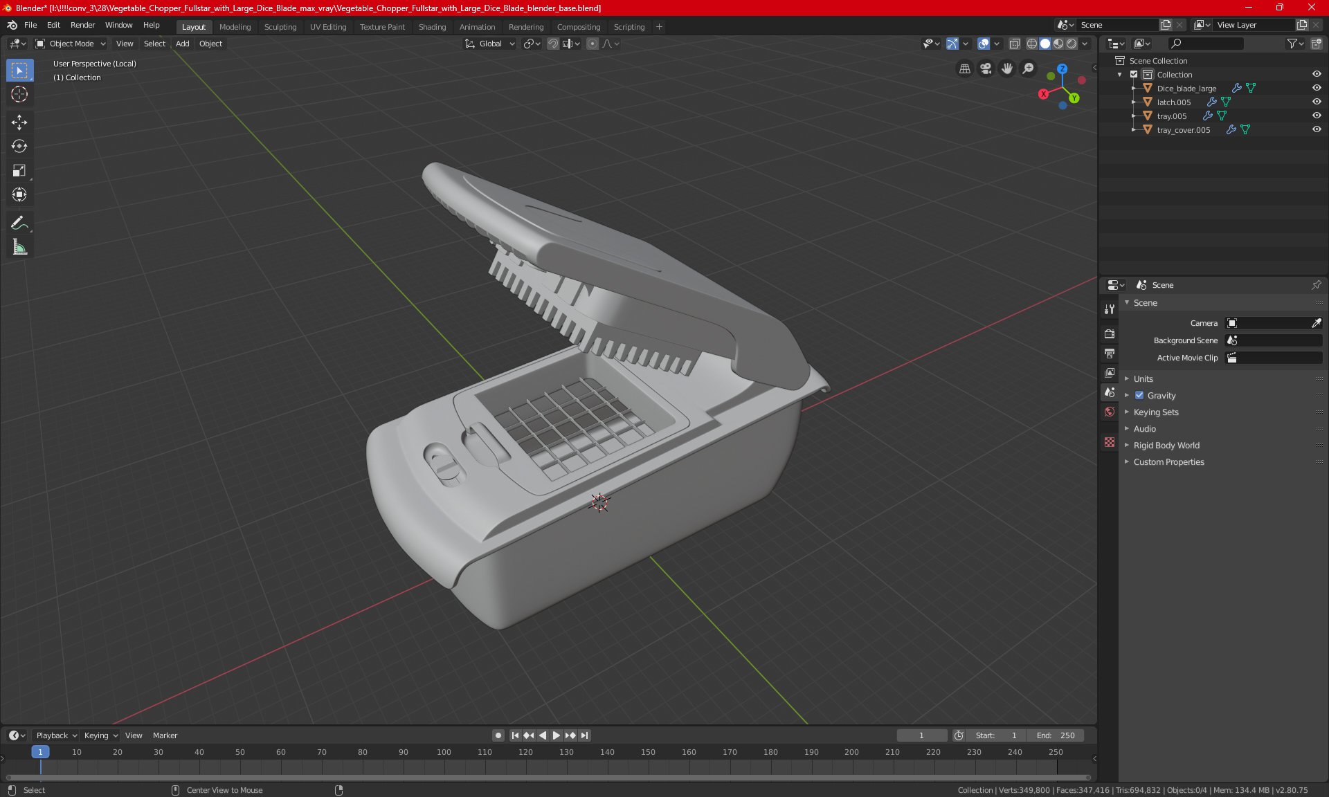 Vegetable Chopper Fullstar with Large Dice Blade is a high quality, photo real 3d model that will enhance detail and realism to any of your rendering projects. The model has a fully textured, detailed design that allows for close-up renders, and was originally modeled in 3ds Max 2020 and rendered with V-Ray. Renders have no postprocessing!