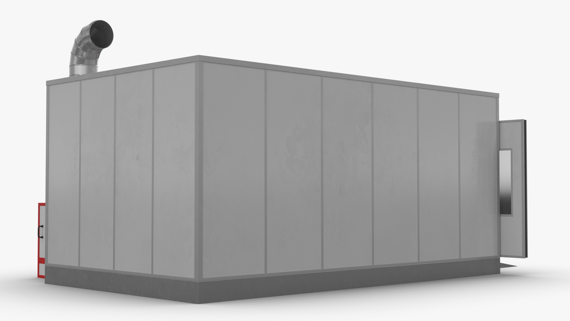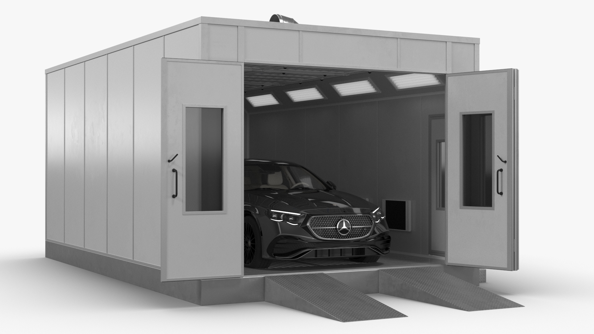 Vehicle Paint Booth with Car Inside is a 3d model of specialized enclosure or room designed for the painting of vehicles, where a car or other automotive vehicle is positioned inside the booth for the application of paint.