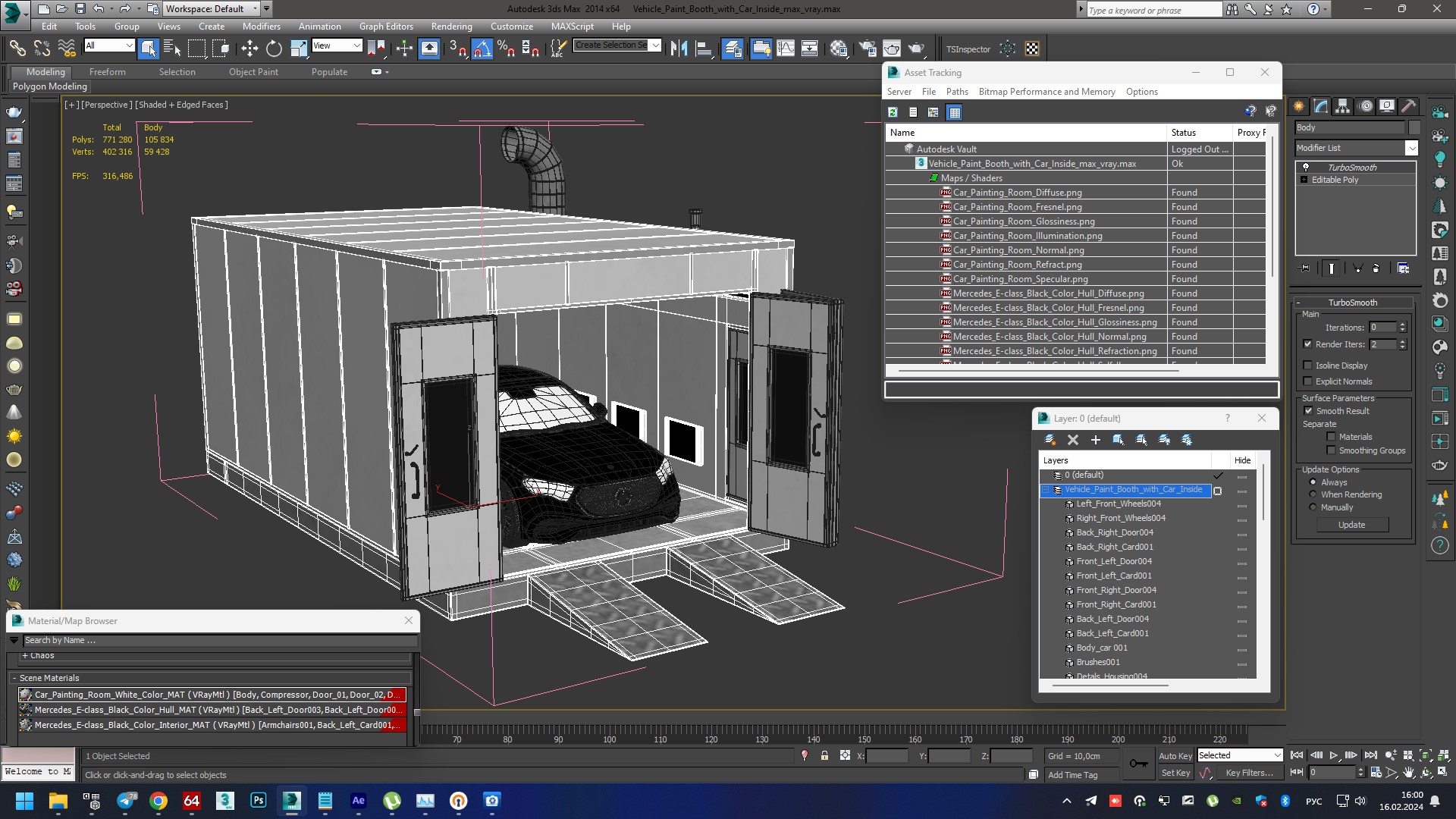 Vehicle Paint Booth with Car Inside is a high quality, photo real 3d model that will enhance detail and realism to any of your rendering projects. The model has a fully textured, detailed design that allows for close-up renders, and was originally modeled in 3ds Max 2020 and rendered with V-Ray. Renders have no postprocessing!