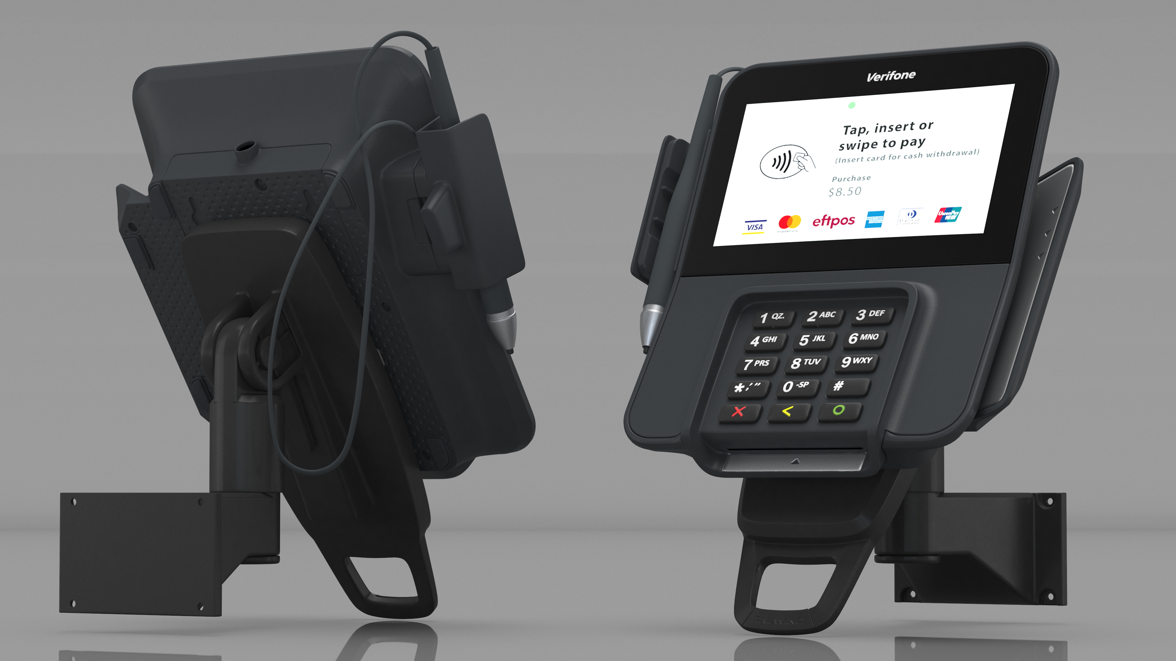Verifone M400 Card Terminal Carrying Wall Bracket is a 3d model of versatile credit card terminal that features a stunning 5” FWVGA display and multi-use, scrolling split screen.