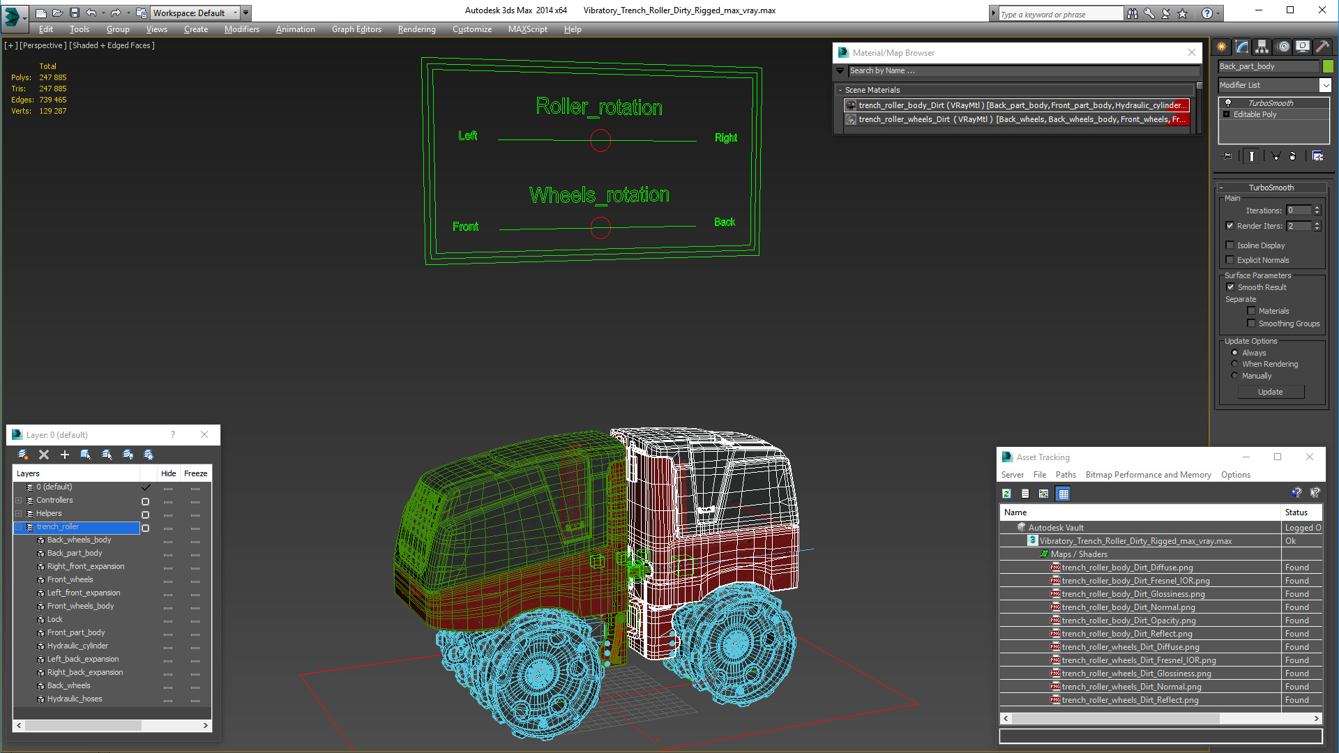 Vibratory Trench Roller Dirty Rigged is fully rigged and is ready to be animated. You can easily position it the way you need or animate it the way your project requires using helpers in 3D Studio Max. See the turntable to get an idea of how rigging works.