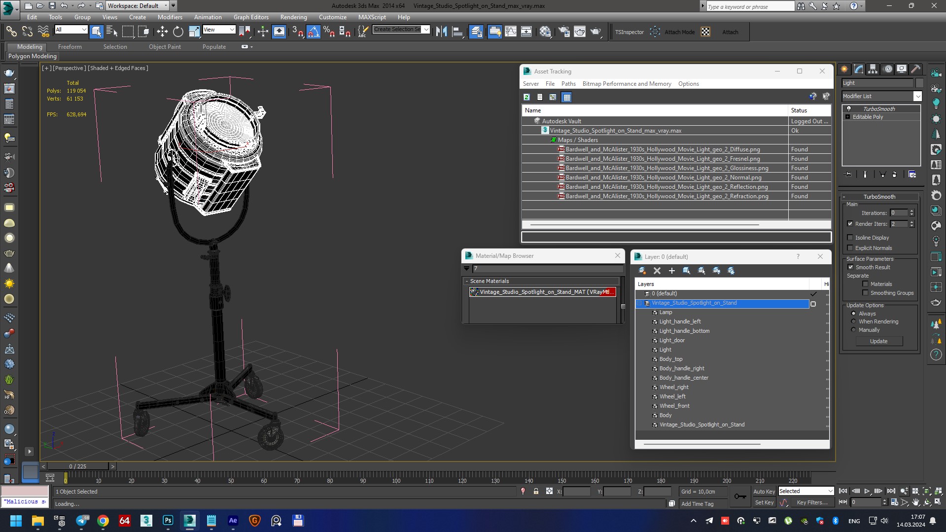 Vintage Studio Spotlight on Stand is a 3d model of type of lighting equipment that was commonly used in film and television studios in the early to mid-20th century. It consists of a large, metal spotlight mounted on a tall, adjustable stand, allowing for the direction and intensity of the light to be controlled. These spotlights were commonly used to illuminate actors or specific areas of a set, creating dramatic lighting effects and enhancing the overall visual aesthetic of a production. For lighting film equipment, light tripod stands, cinematography art, lighting accessories, light devices, video equipment, photograph tools, spotlight holders, and television studio works promotional projects. Vintage Studio Spotlight on Stand is a high quality, photo real 3d model that will enhance detail and realism to any of your rendering projects. The model has a fully textured, detailed design that allows for close-up renders, and was originally modeled in 3ds Max 2020 and rendered with V-Ray. Renders have no postprocessing! Also there are original texture files with all layers. PSD format in particular archive. Hope you like it! ***** Features: - High quality polygonal model, has real dimensions. Easy to merge into your scene. - Units: cm - The model was created with the optimal number of polygons. (The Meshsmooth modifier is assigned to the original mesh. Easy to increase mesh resolution if necessary.) - All the objects come with complete UVs All textures and materials are included and mapped. (All colors can be easily modified.) - All objects are logically named and grouped for ease of objects selection and scene management. - No part-name confusion when importing several models into a scene. - No cleaning up necessary (Model does not include any backgrounds or scenes used in preview images.) - just drop model into your scene. - No special plugin needed to open scene. - PBR Materials ***** File Formats: - 3ds Max - Cinema 4D - Maya - Blender - OBJ, 3DS, FBX ***** Textures Formats: - 6 png (4096x4096) ***** 3d Molier International is a team of 3D artists with over a 15 years of experience. The company participated in various projects allowing us to learn our clients needs. Every model we build goes through thorough Quality assessment both visual and technical to make sure the assets look realistic and the models are of the best quality, which you can tell by looking at the renders - none of the has any postprocessing. We produce 3D models. This is our main activity. Our goal is to create a 3D copy of all objects on the world. Buy 3D models from professionals! Also check out our other models, just click on our user name to see complete gallery. (c) 3d_molier International - 2025