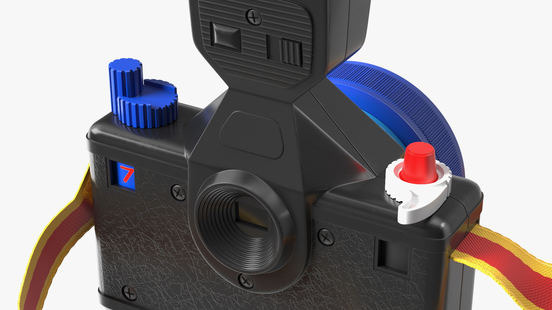 This model highlights the simplicity and charm of vintage toy cameras, with detailed features like a basic lens, a compact body, and a functional-looking flash component. Its design evokes a sense of nostalgia, capturing the essence of playful, early photography toys from past decades. The model combines retro design elements with smooth contours and realistic textures, making it perfect for visual presentations and product displays.