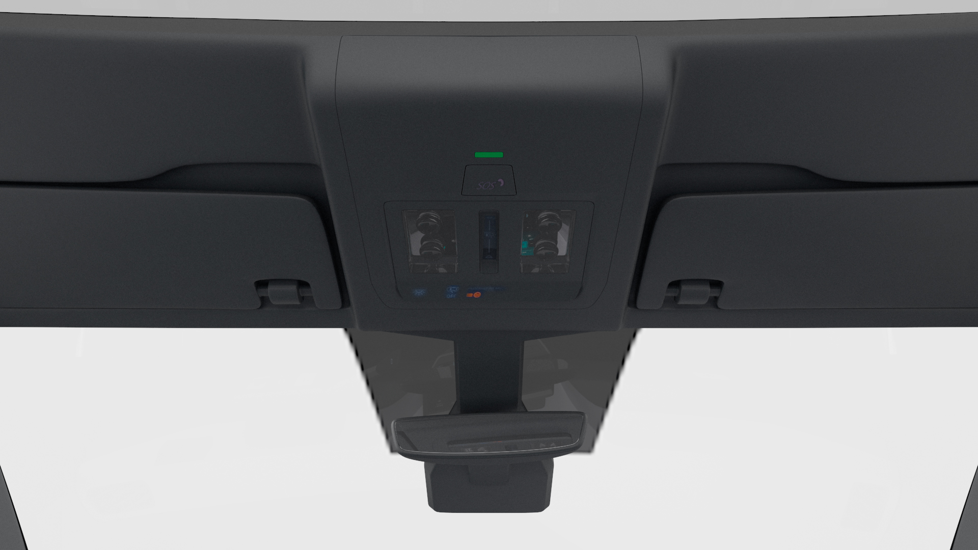 Contemporary electric vehicle (EV) with virtual wing mirrors (using video cameras), rear-wheel drive layout, retractable LiDAR sensors used for autonomous driving and single-speed transmission.