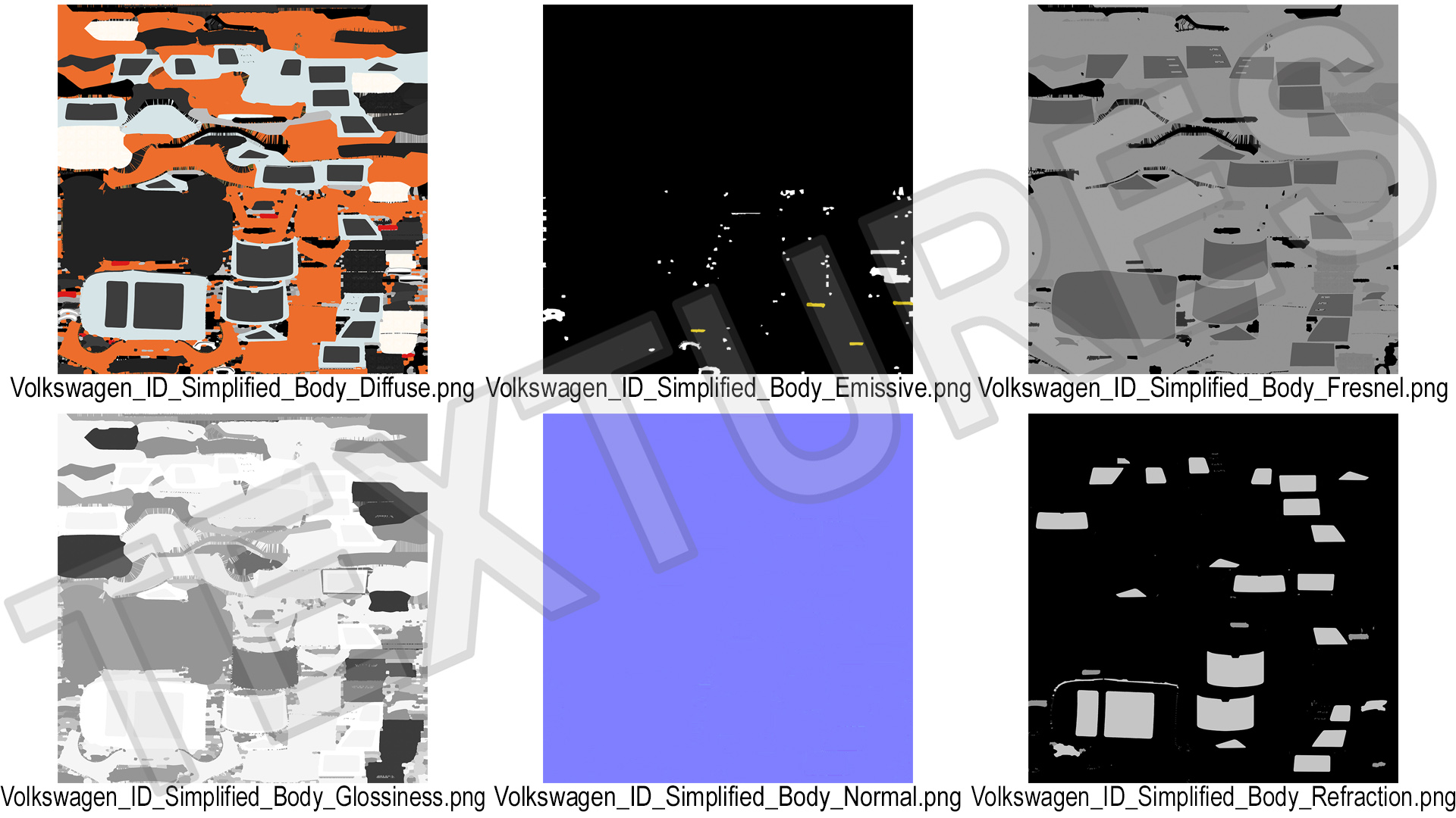 All textures and materials are included and mapped. (All colors can be easily modified.)