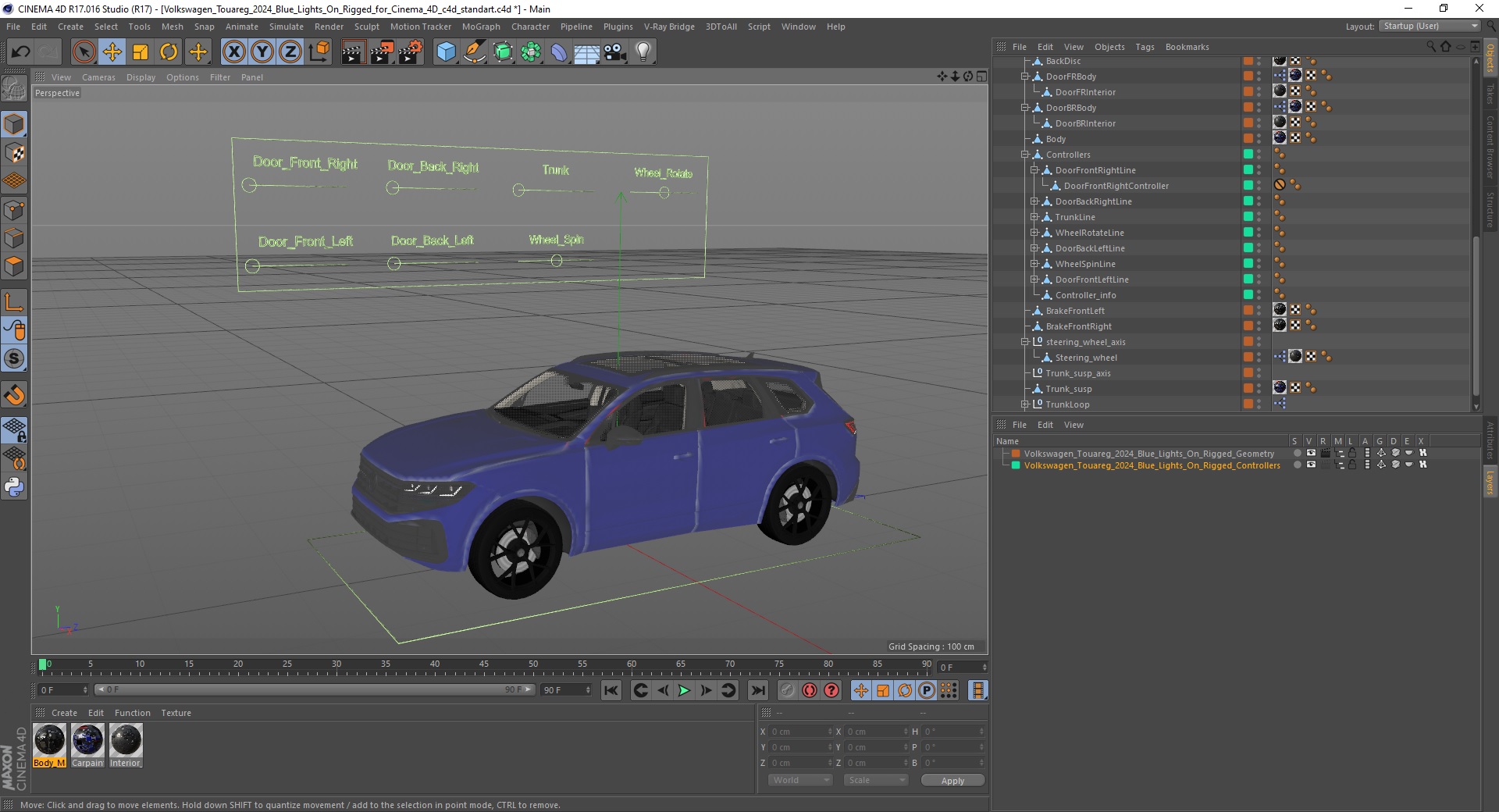 Volkswagen Touareg 2024 Blue Lights On Rigged for Cinema 4D is fully rigged and is ready to be animated in Cinema 4D. You can easily position it the way you need or animate it the way your project requires. See the screenshots to get an idea of how rigging works. The pose of the model on the render images is an example and can be recreated using rig, it is not initially included into the product.