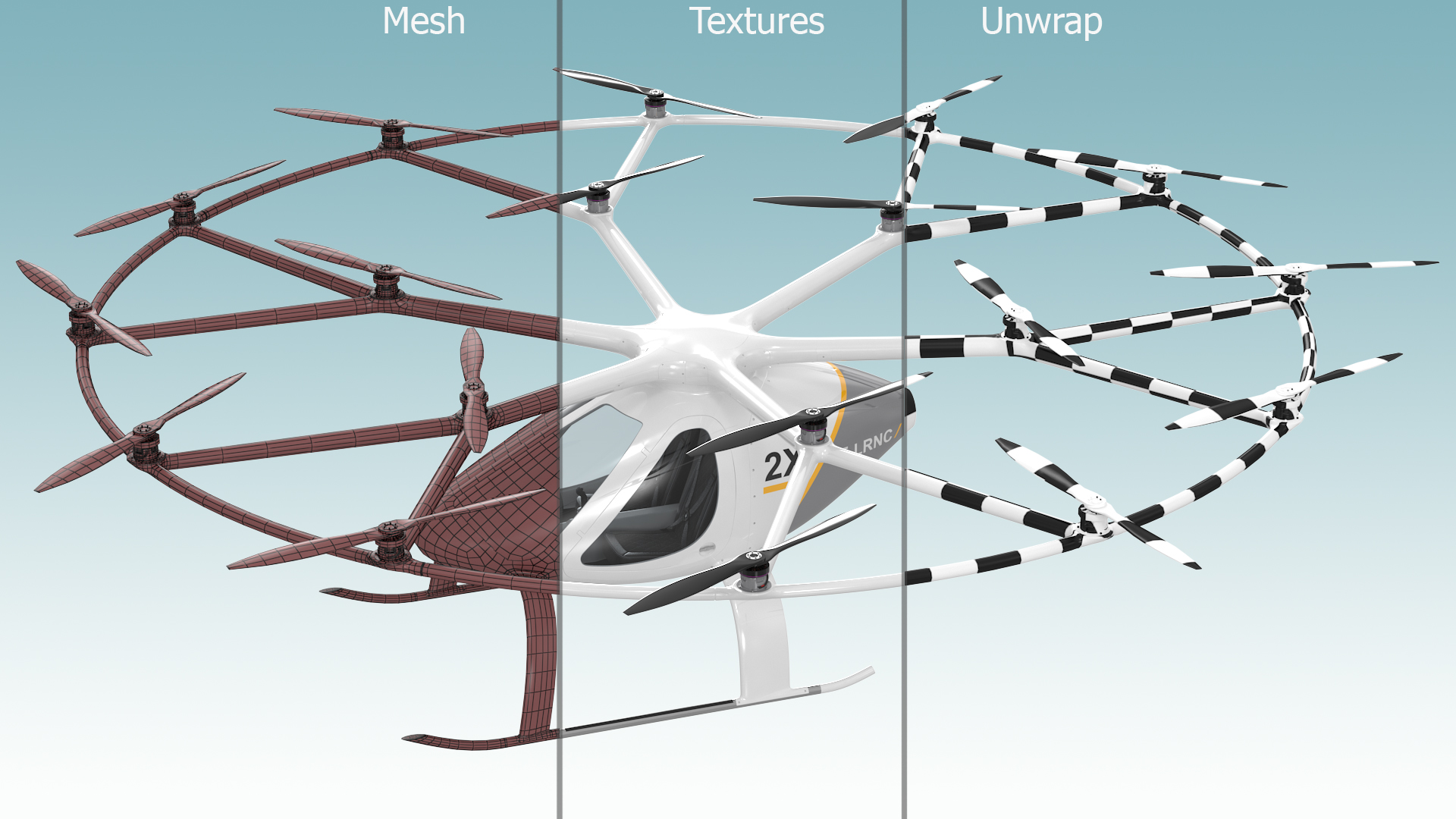 Volocopter E-Volo VC 400 is a high quality, photo real 3d model that will enhance detail and realism to any of your rendering projects. The model has a fully textured, detailed design that allows for close-up renders, and was originally modeled in 3ds Max 2020 and rendered with V-Ray. Renders have no postprocessing!