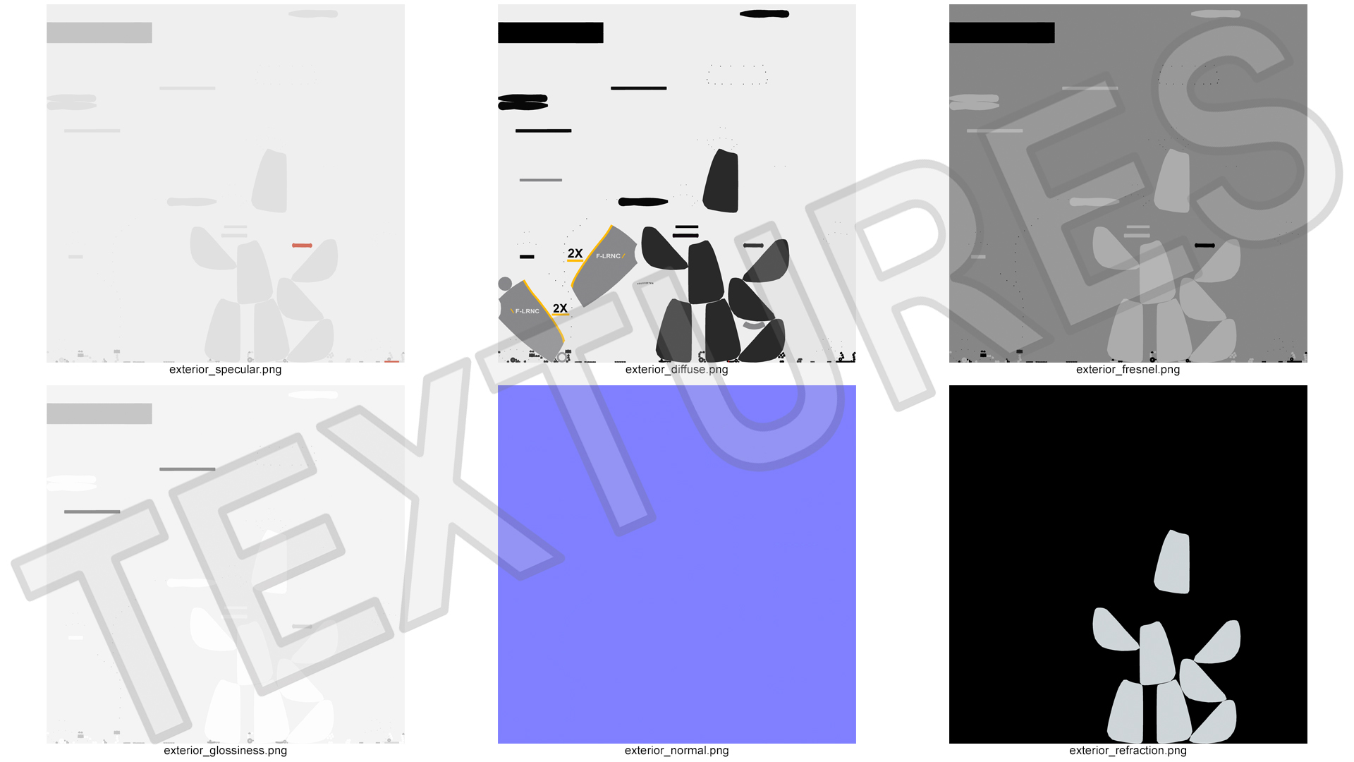 All textures and materials are included and mapped. (All colors can be easily modified.)