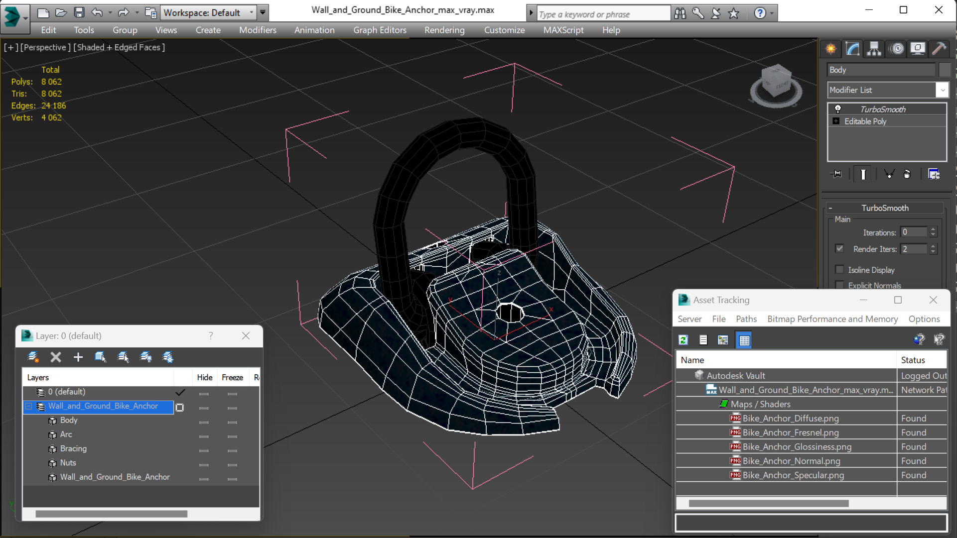 Wall and Ground Bike Anchor is a 3D model of a high-security anchor point which can be used to provide maximum protection for bike vehicle and which is protection against theft.