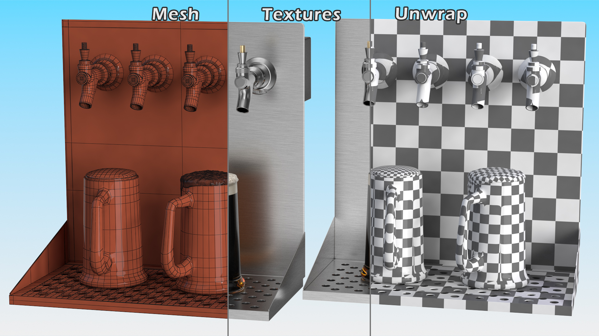 Wall Mount Beer Dispenser with Beer Mugs is a high quality, photo real 3d model that will enhance detail and realism to any of your rendering projects. The model has a fully textured, detailed design that allows for close-up renders, and was originally modeled in 3ds Max 2020 and rendered with V-Ray. Renders have no postprocessing!
