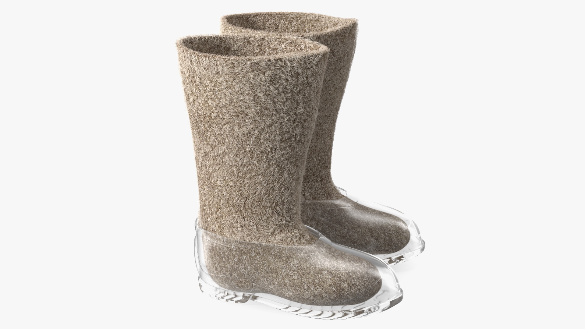 Warm Rustic Felt Boots With Transparent Galoshes Fur is a 3d model of traditional Russian winter footwear with waterproof boots that protect from rain, snow, and salt damage.