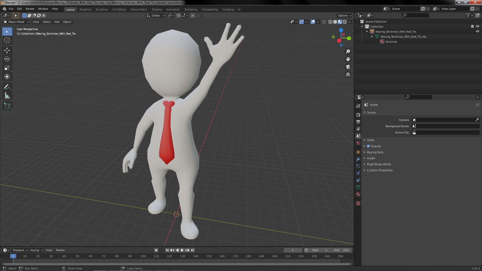Waving Stickman With Red Tie is a high quality, photo real 3d model that will enhance detail and realism to any of your rendering projects. The model has a fully textured, detailed design that allows for close-up renders, and was originally modeled in 3ds Max 2020 and rendered with V-Ray. Renders have no postprocessing!