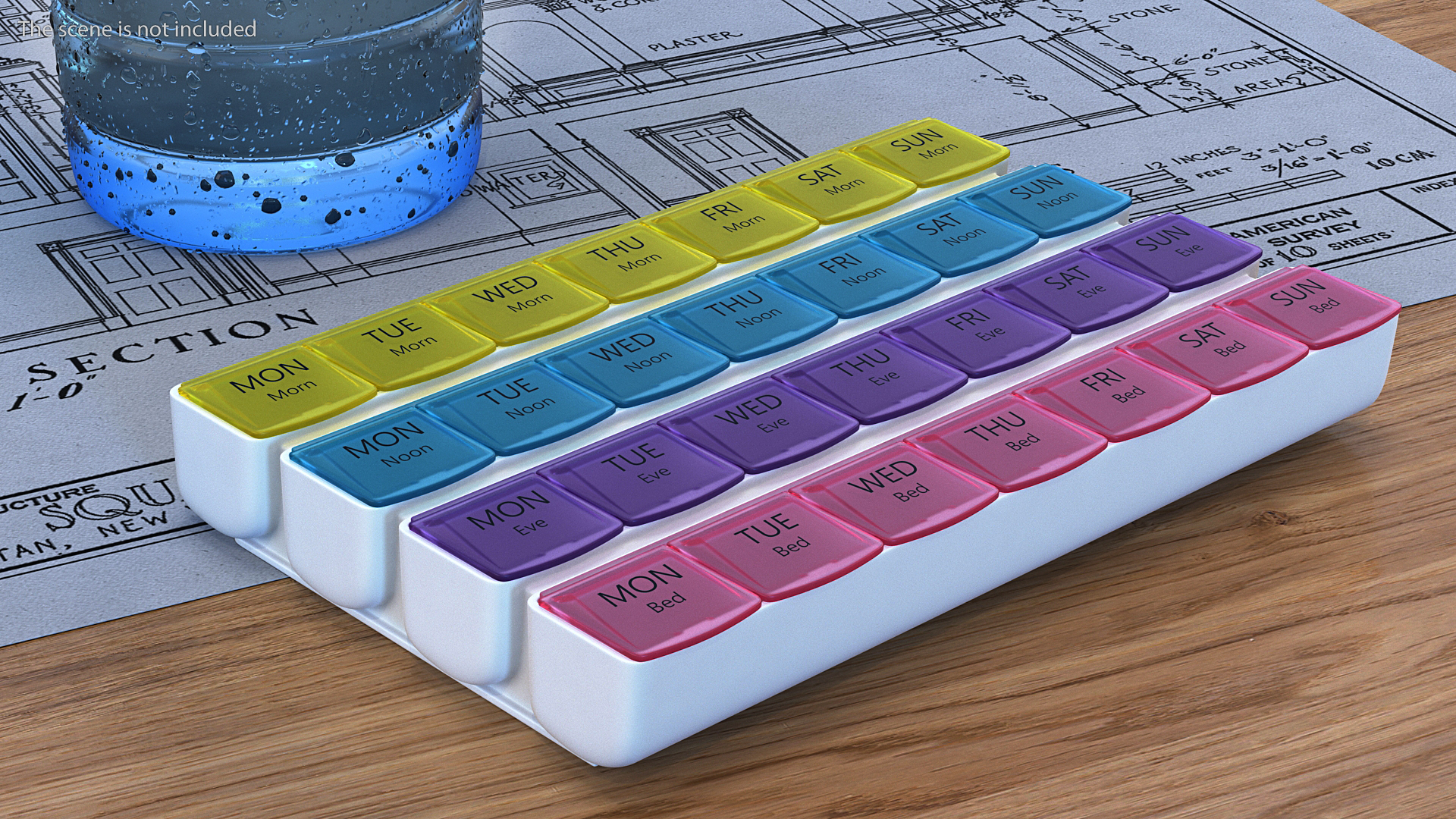 Weekly Pill Organizer 4 Times a Day is a high quality, photo real 3d model that will enhance detail and realism to any of your rendering projects. The model has a fully textured, detailed design that allows for close-up renders, and was originally modeled in 3ds Max 2020 and rendered with V-Ray. Renders have no postprocessing!
