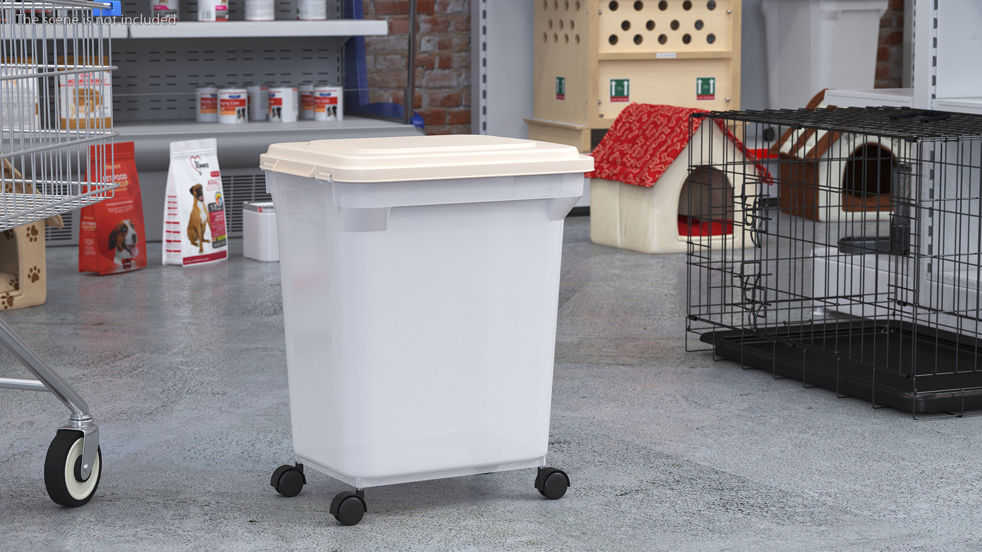 Wheeled Plastic Storage Container White is a three-dimensional model of wheeled plastic storage container which serves as a mobile box which designed specifically for storing pet food.