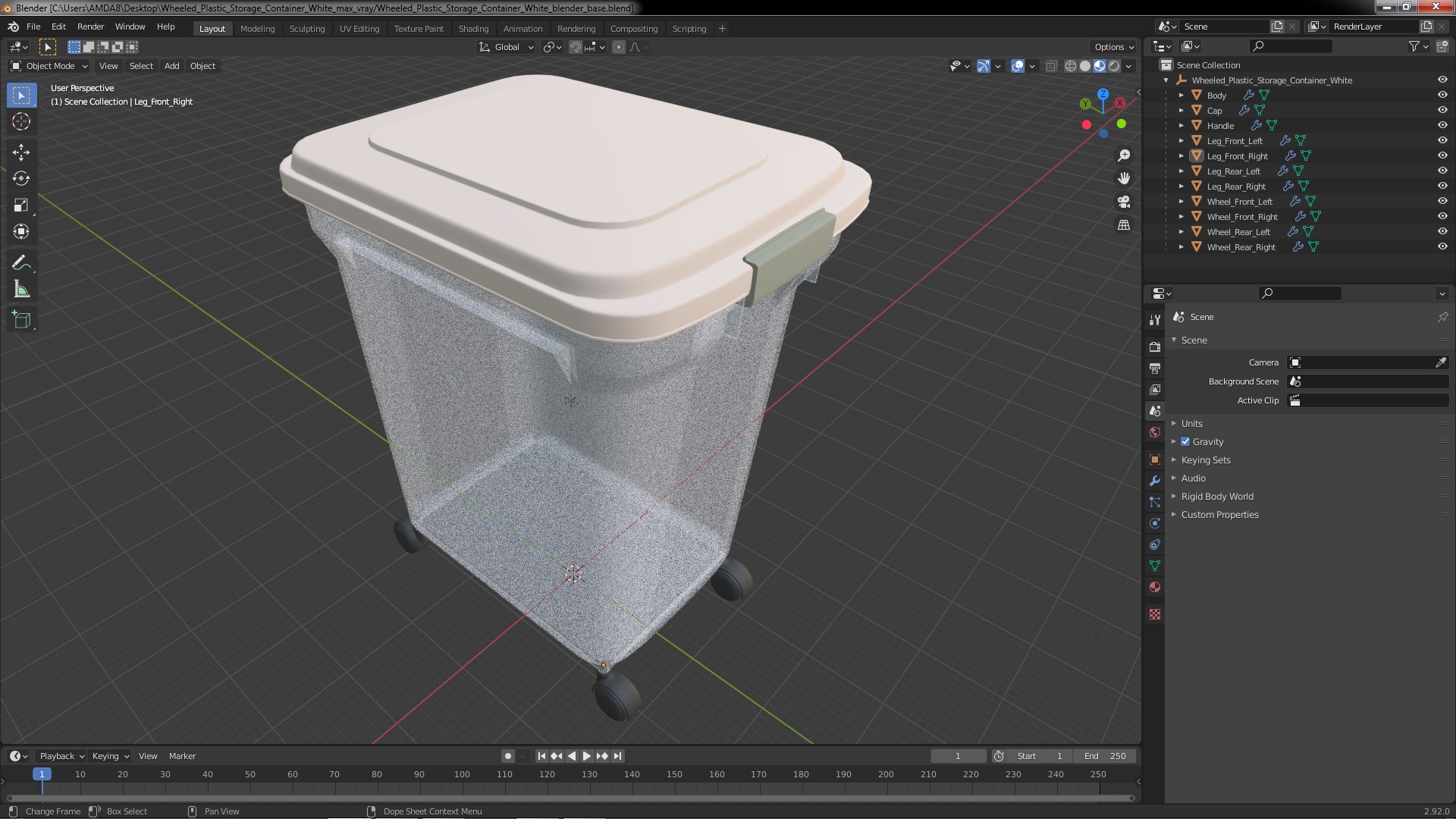 Wheeled Plastic Storage Container White is a high quality, photo real 3d model that will enhance detail and realism to any of your rendering projects. The model has a fully textured, detailed design that allows for close-up renders, and was originally modeled in 3ds Max 2020 and rendered with V-Ray. Renders have no postprocessing!