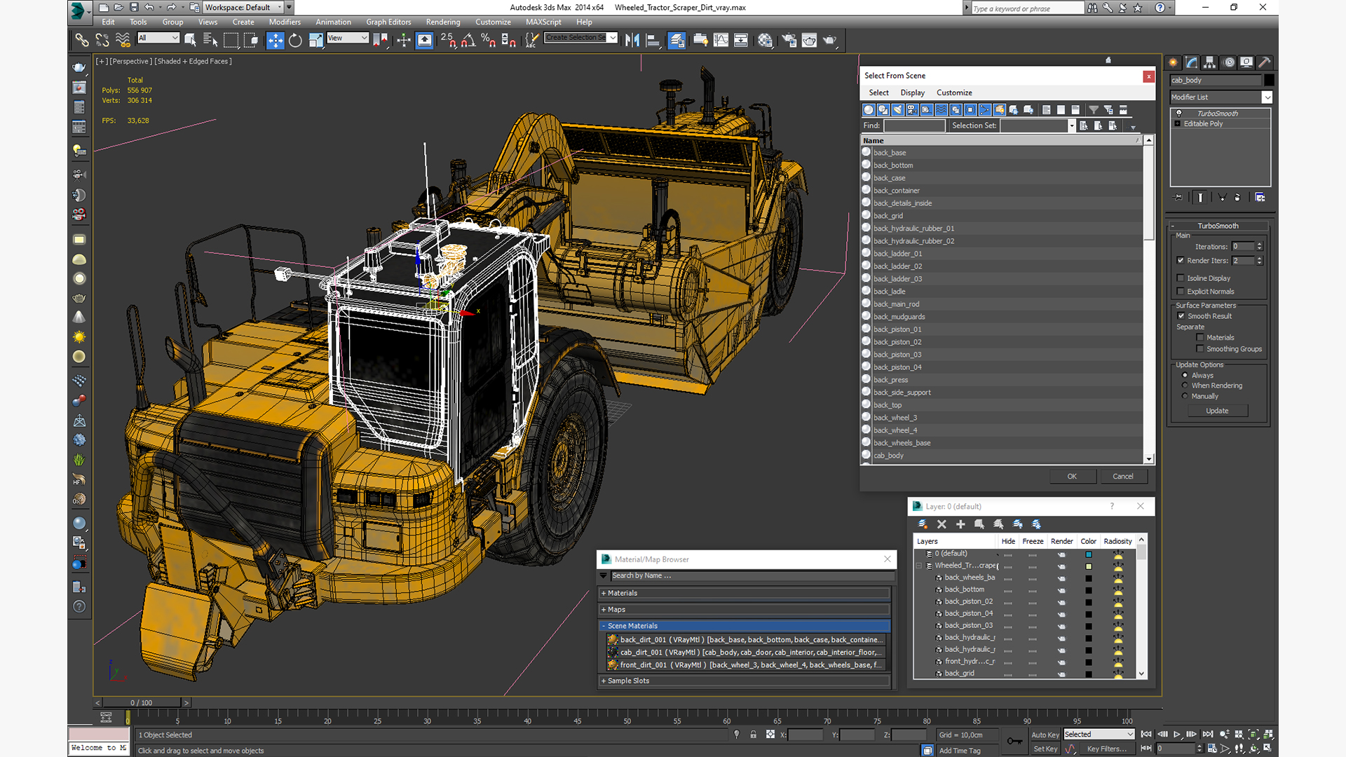 Wheeled Tractor Scraper Dirt is a three-dimensional model of a specialized heavy duty machinery, which designed for earthmoving works or earthworks.
