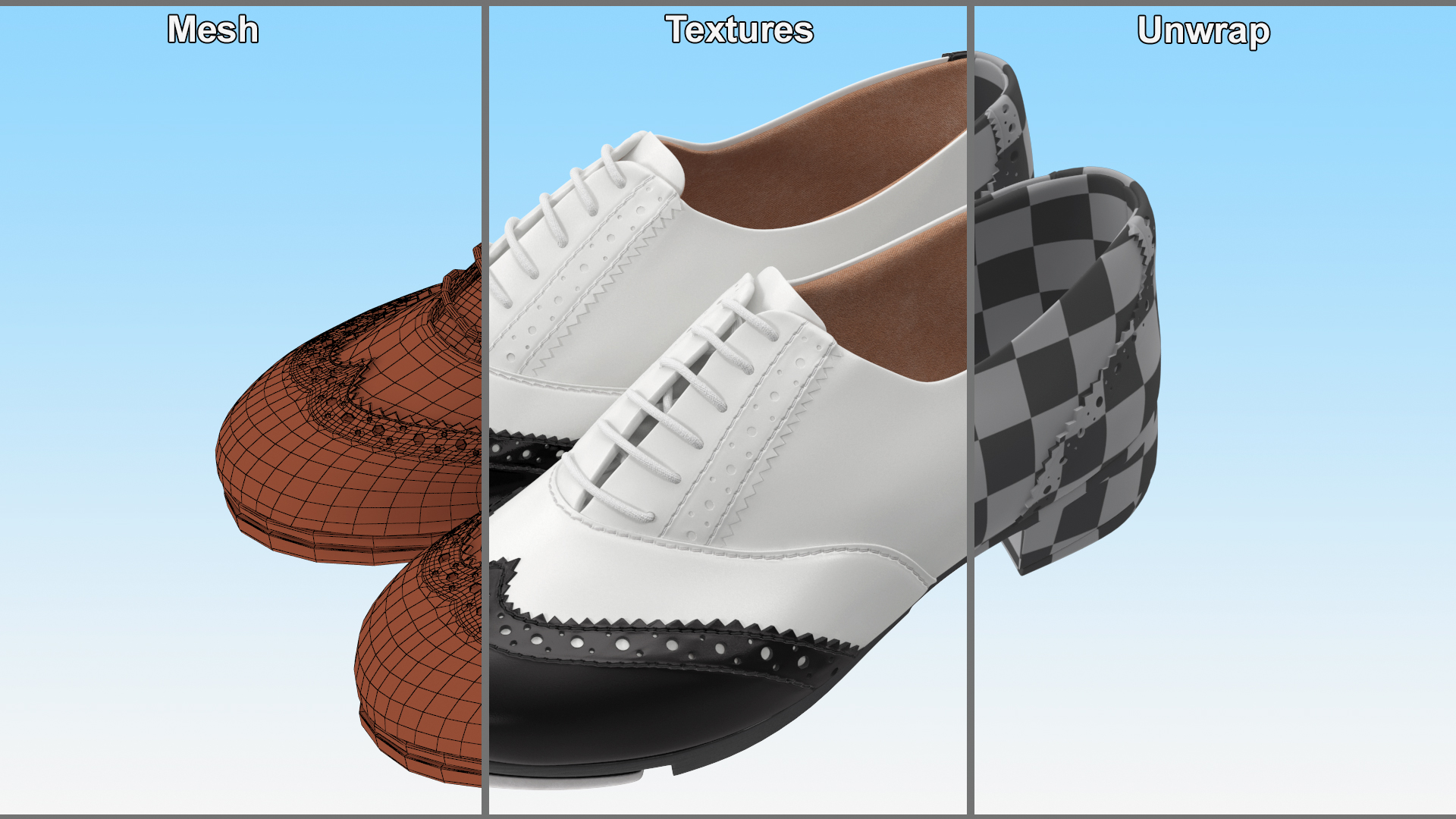 White Black Tap Shoes is a 3d model of shoes worn by tap-dancers which are equipped with taps that make a rhythmic sound when the shoes are used for dancing.
