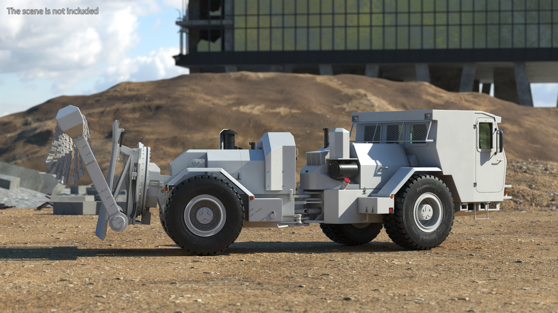 White Mine Clearing Vehicle Hydrema 910 Rigged is a 3d model of type of mine clearing vehicle used for clearing landmines and other explosive devices from roads and other areas.