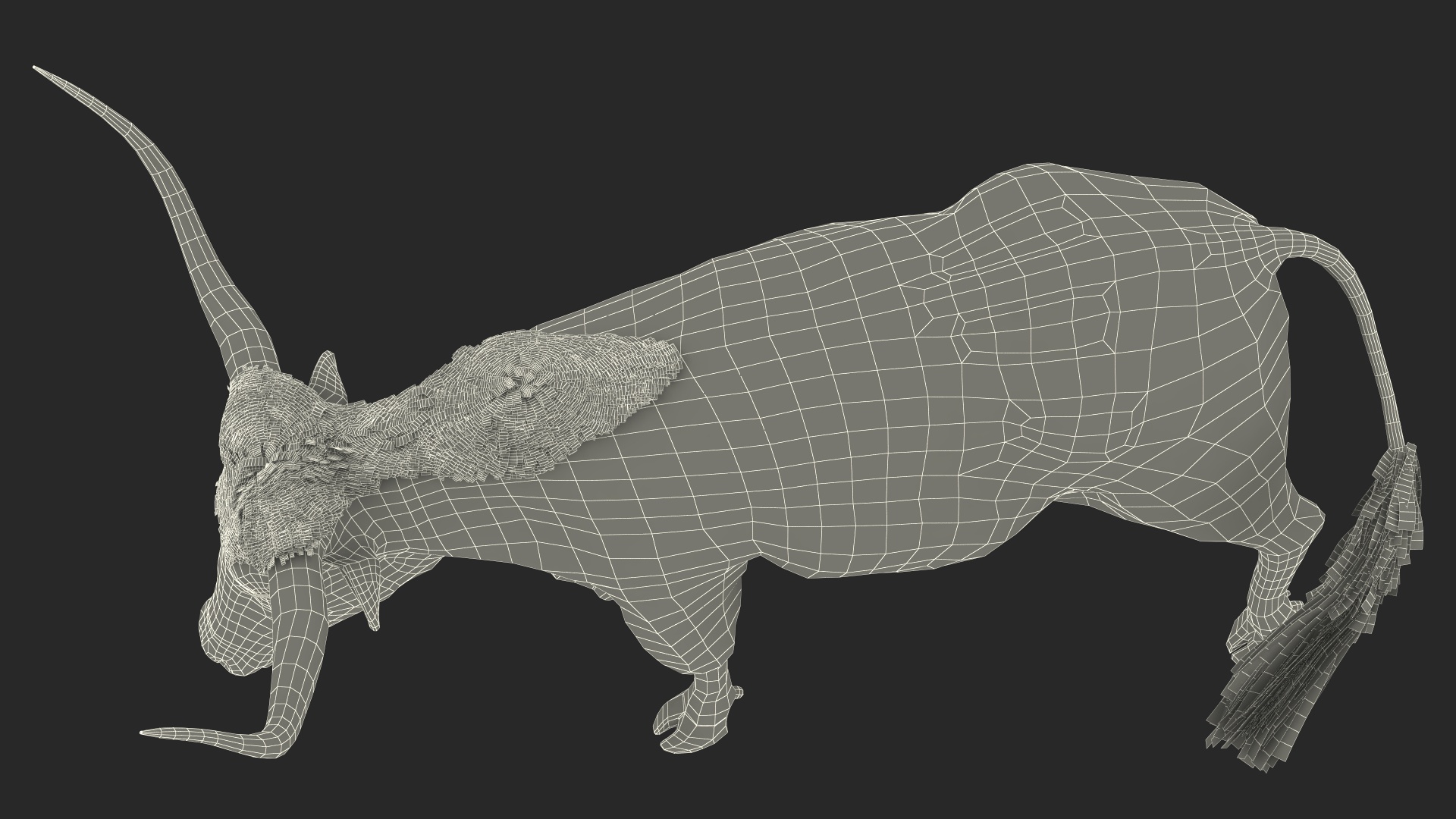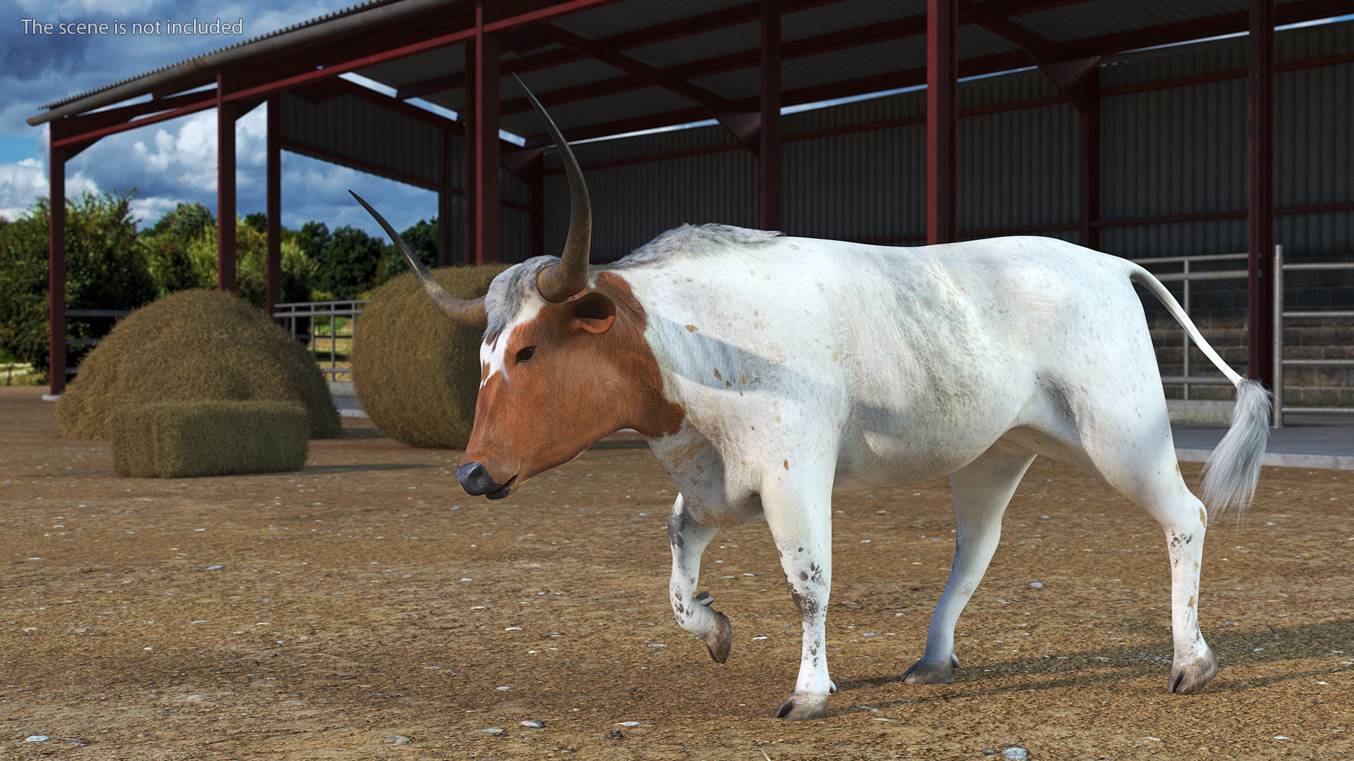 White Texas Longhorn Bull Walking Pose is a three-dimensional model of large Texas Longhorn bull which characterized by its long and noticeable curved horns, muscular build, extensive horn span, and stocky build, suitable for western ranch and wildlife scenes.