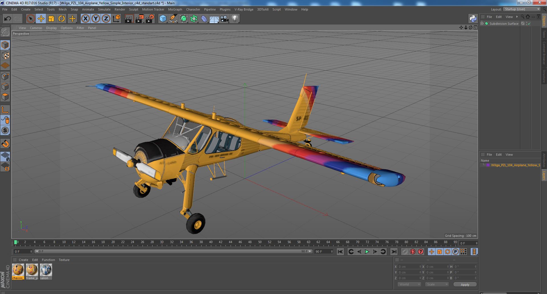 Wilga PZL 104 Airplane Yellow Simple Interior is a high quality, photo real 3d model that will enhance detail and realism to any of your rendering projects. The model has a fully textured, detailed design that allows for close-up renders, and was originally modeled in 3ds Max 2020 and rendered with V-Ray. Renders have no postprocessing!