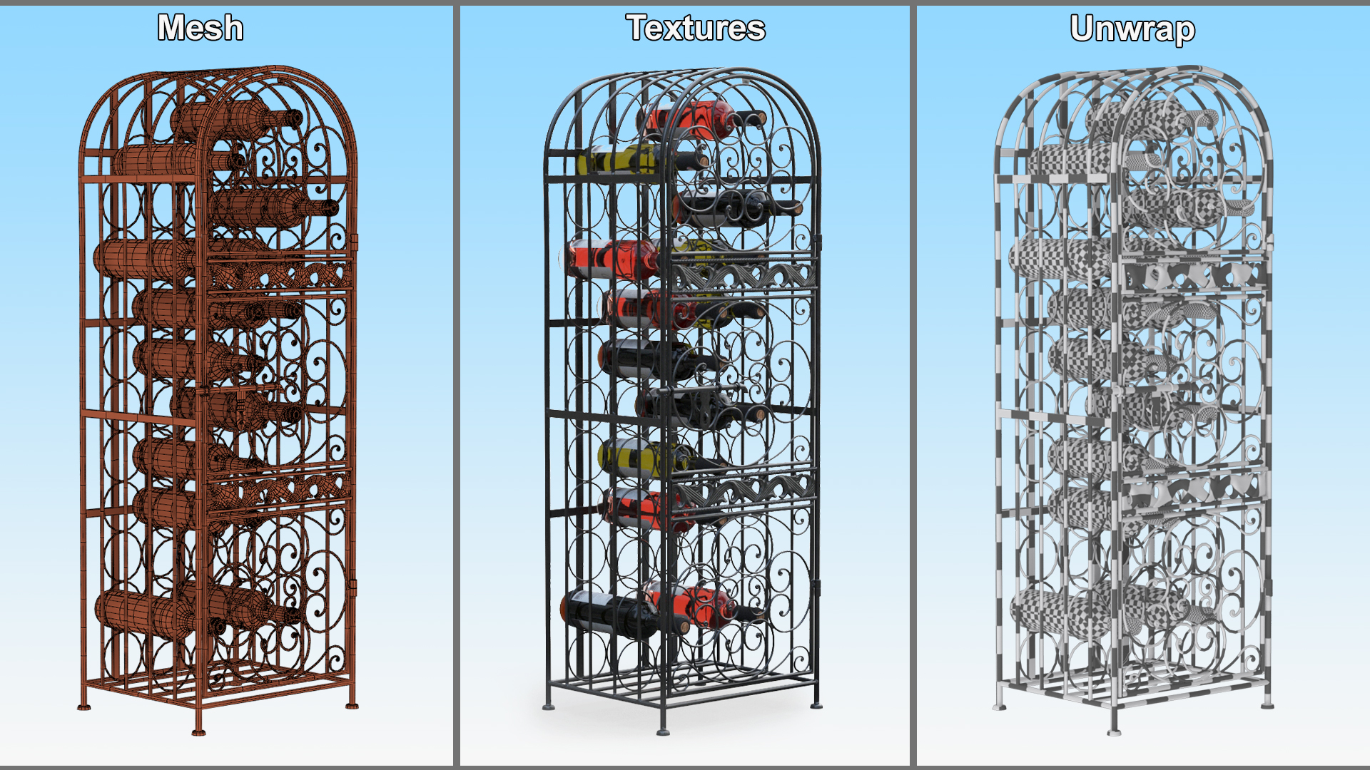 Wine Rack Cabinet with Bottles is a three-dimensional model of sommelier's glass bottle lockable wine rack with round top, that is a decorative iron metal cage cabinet used to wine bottles secure storage.