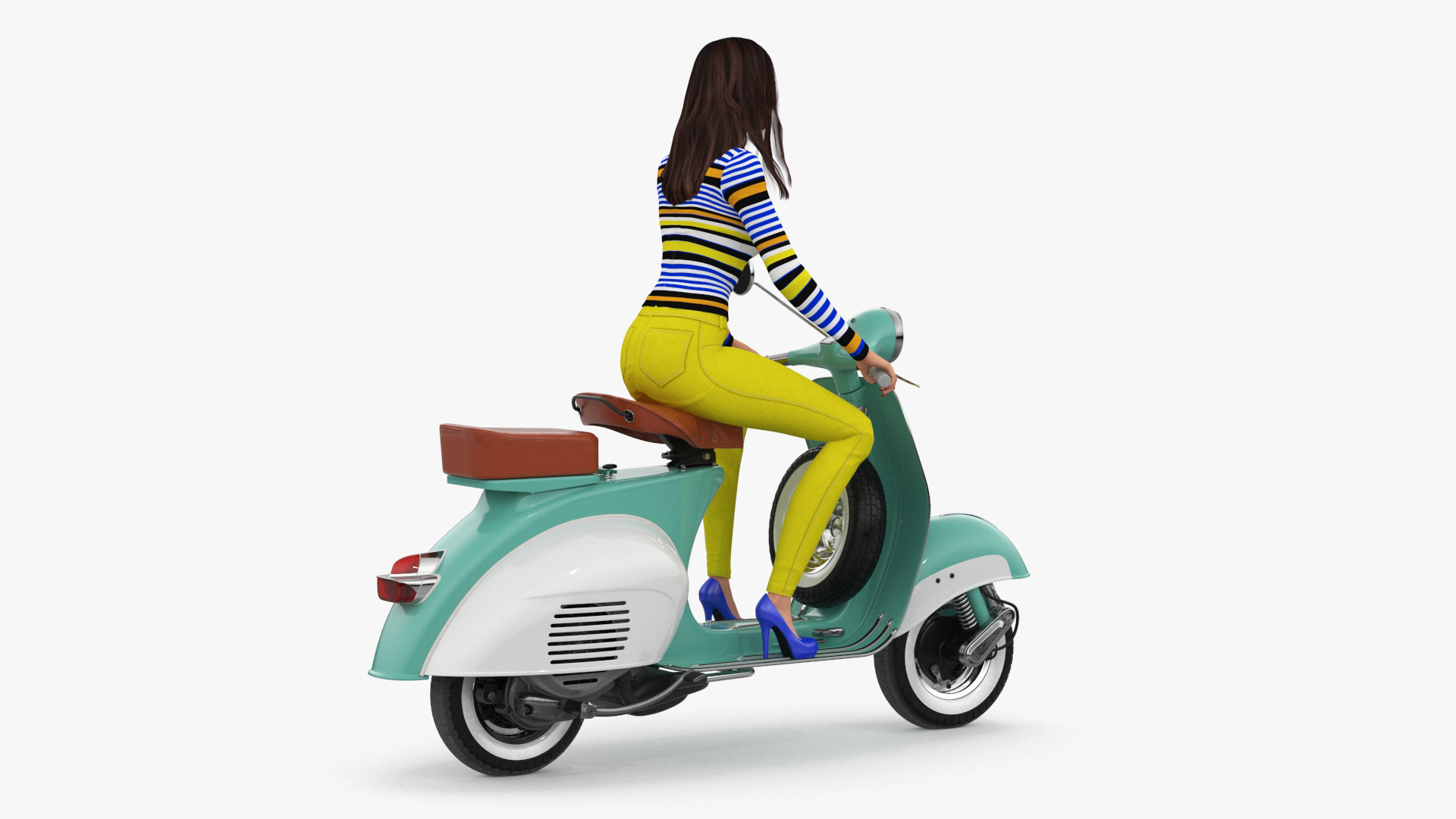 Woman Riding Vespa 125 Retro Scooter is a three-dimensional model of young female rider character with classic style scooter (moped) that is a retro style two-wheeler type vehicle.