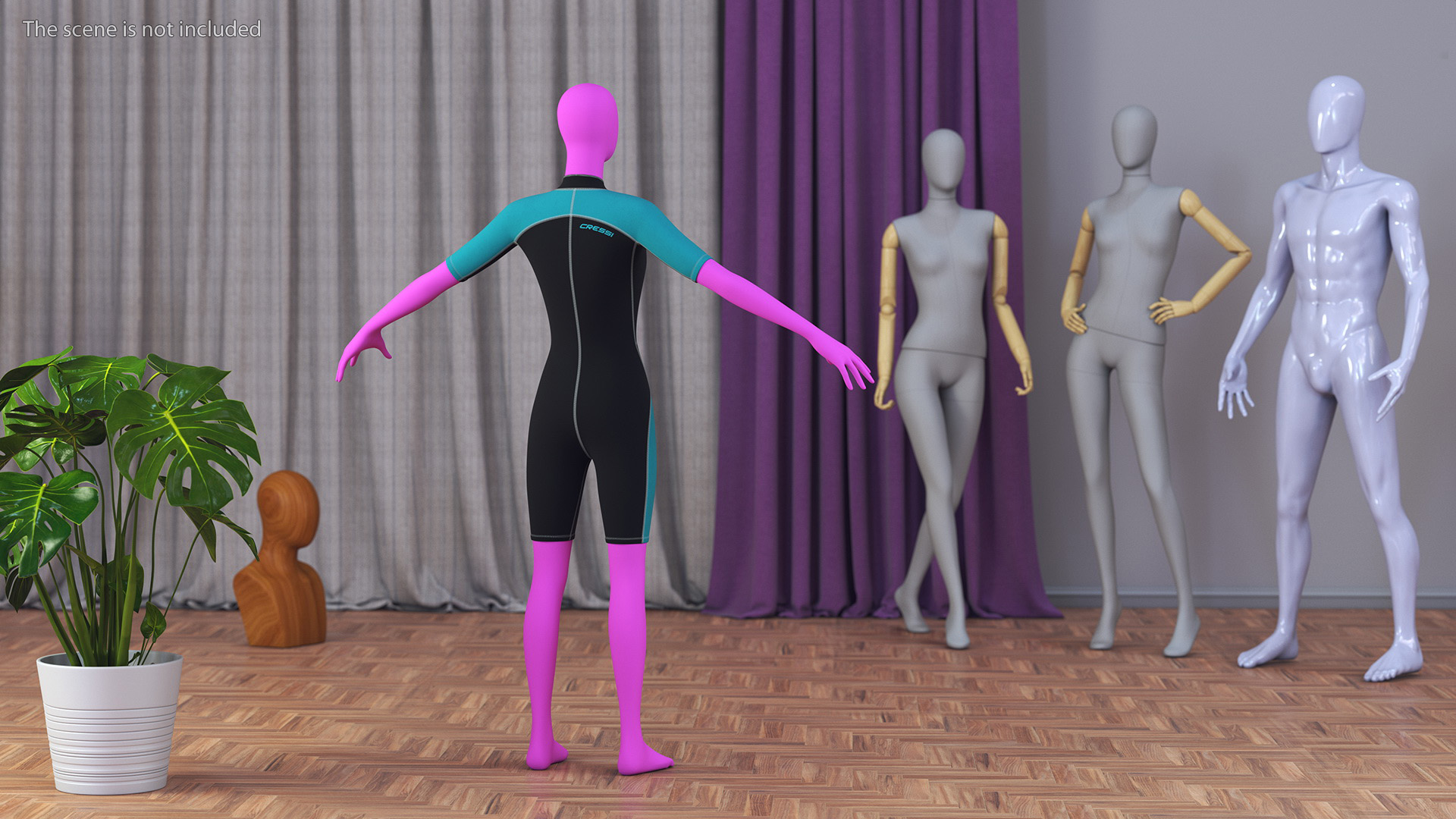 Woman Wetsuit Cressi Shorty Version is a three-dimensional model of mannequin (dummy) with female wetsuit which is a high-quality neoprene suit designed for various water activities, including diving, surfing, snorkeling and more.