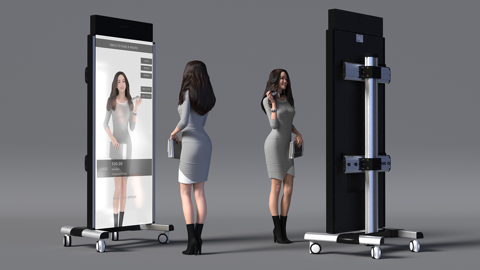 Woman with Virtual Dressing Mirror is a three-dimensional model of female shopper with an interactive retail smart mirror which provides a real-time virtual fitting experience for shoppers, and which equipped with a touchscreen interface for various functions in a store setting.