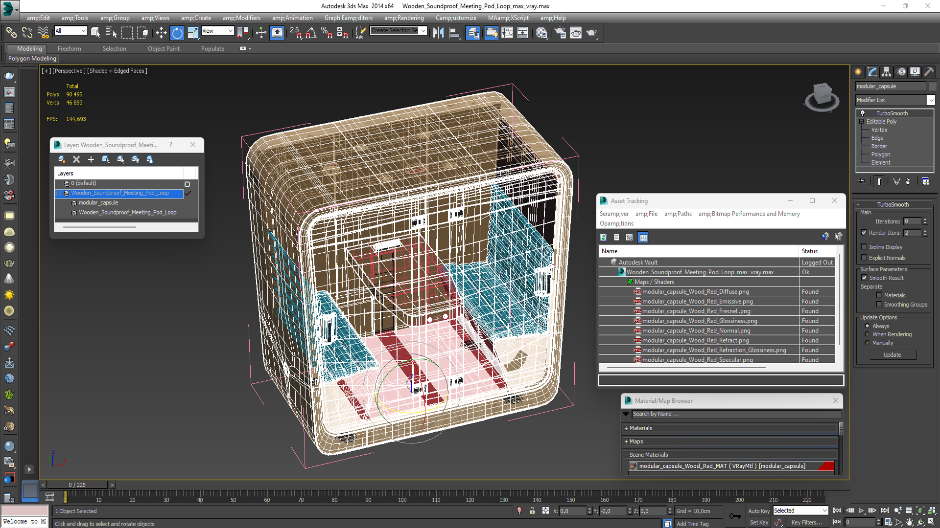 Wooden Soundproof Meeting Pod Loop is a high quality, photo real 3d model that will enhance detail and realism to any of your rendering projects. The model has a fully textured, detailed design that allows for close-up renders, and was originally modeled in 3ds Max 2020 and rendered with V-Ray. Renders have no postprocessing!