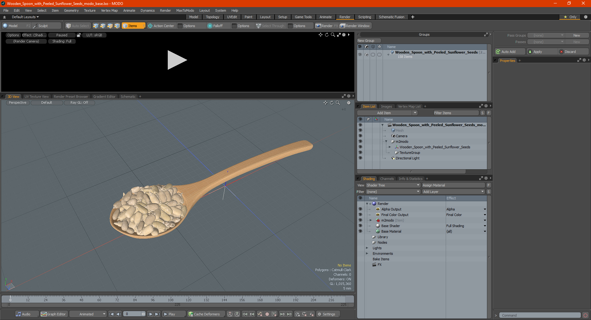 Wooden Spoon with Peeled Sunflower Seeds is a high quality, photo real 3d model that will enhance detail and realism to any of your rendering projects. The model has a fully textured, detailed design that allows for close-up renders, and was originally modeled in 3ds Max 2020 and rendered with V-Ray. Renders have no postprocessing!