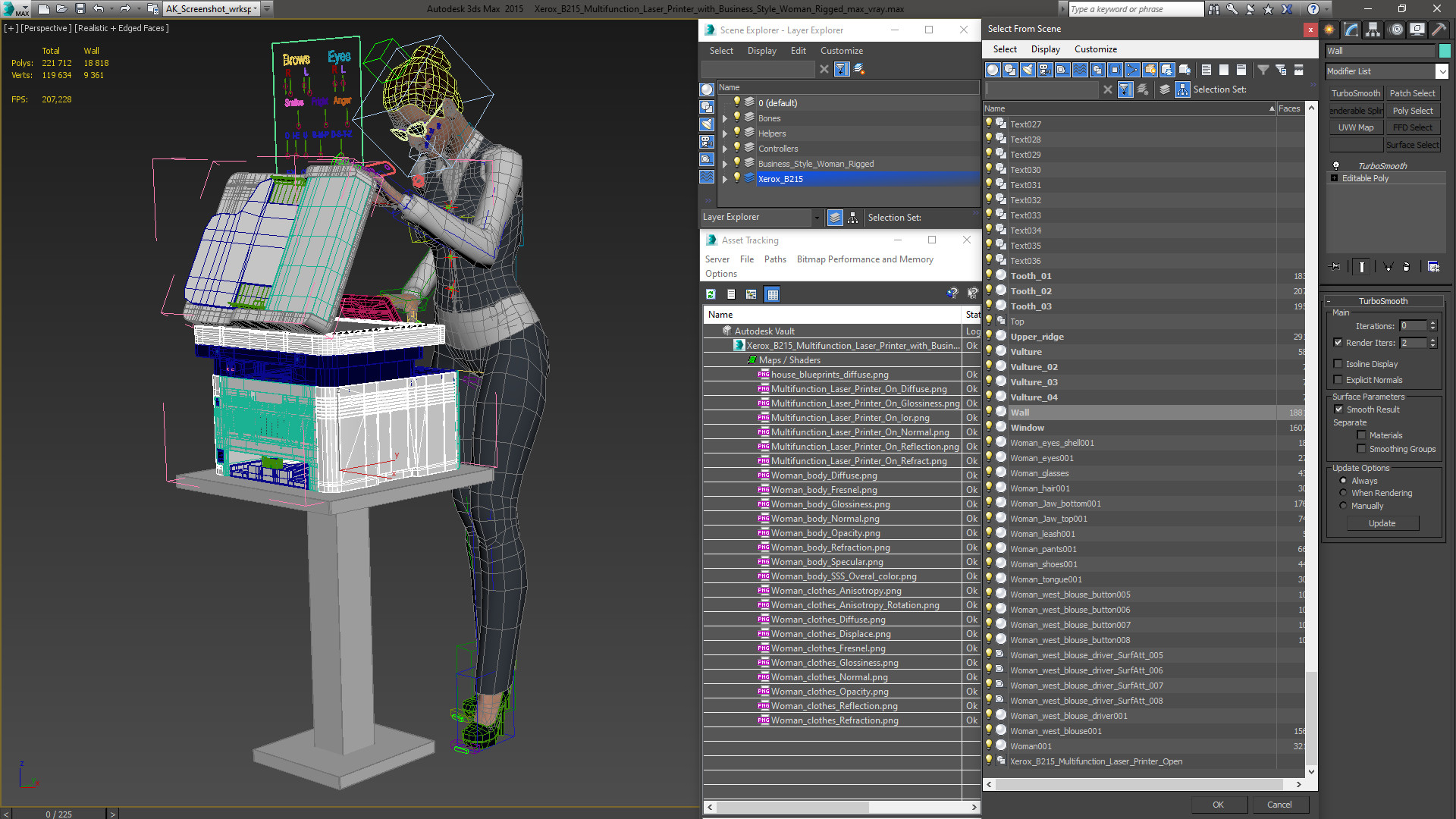 Xerox B215 Multifunction Laser Printer with Business Style Woman Rigged is fully rigged and is ready to be animated. You can easily position it the way you need or animate it the way your project requires using helpers in 3D Studio Max. See the turntable to get an idea of how rigging works.