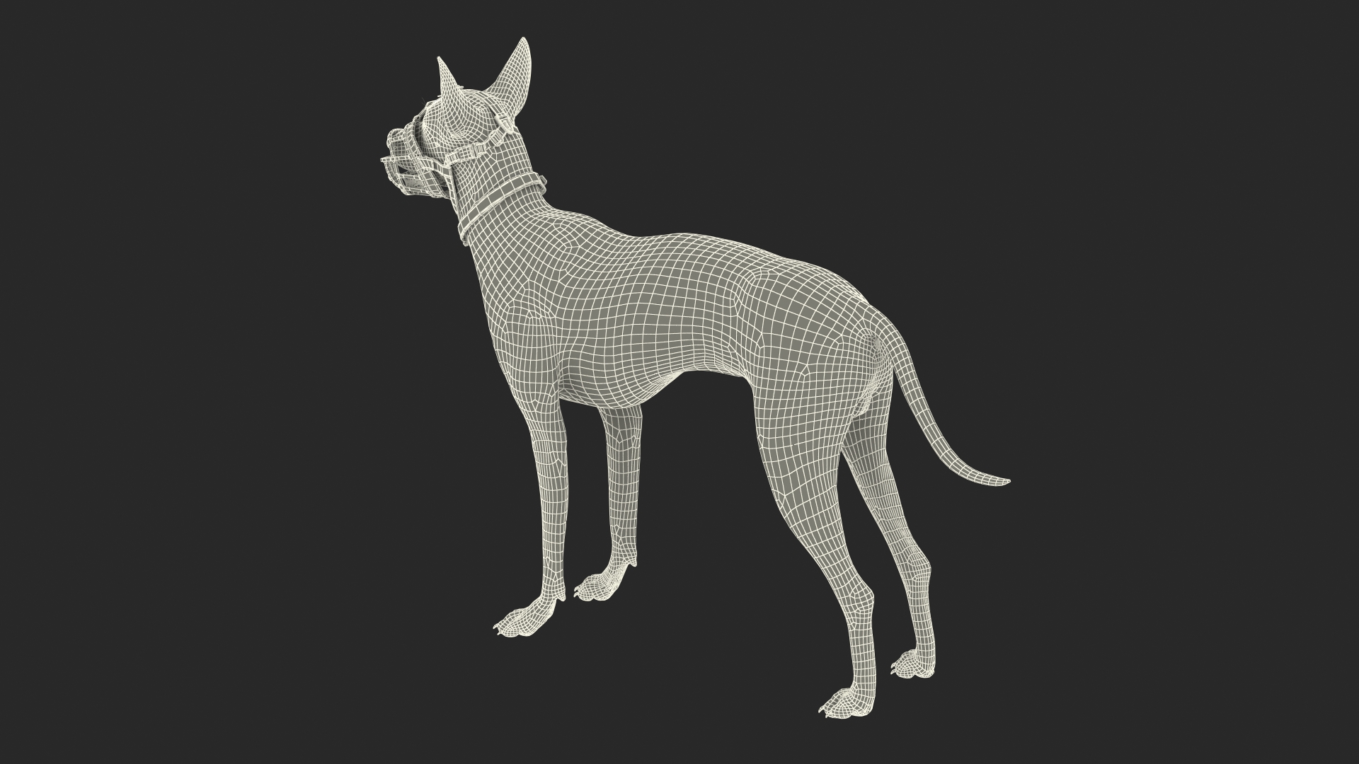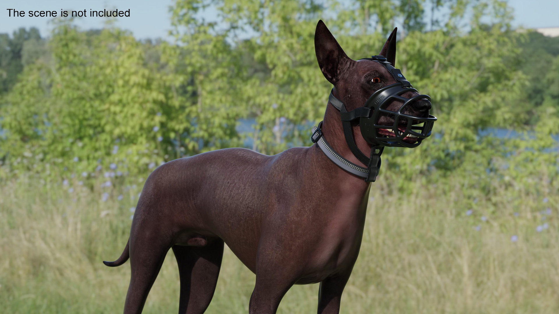 Xoloitzcuintli in a Baskerville Muzzle is a three-dimensional model of dog pet with a dog muzzle that is a pet accessory designed to cover a dog's snout and prevent biting, barking, or chewing.