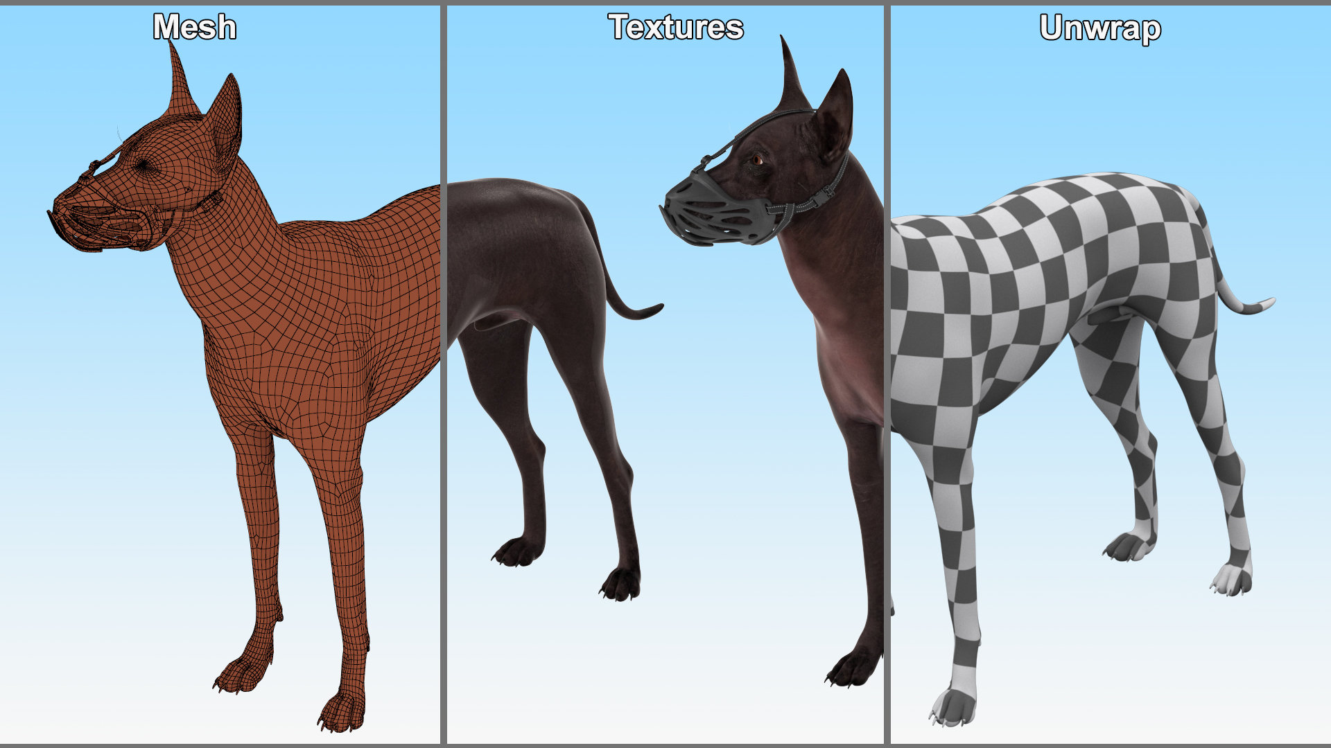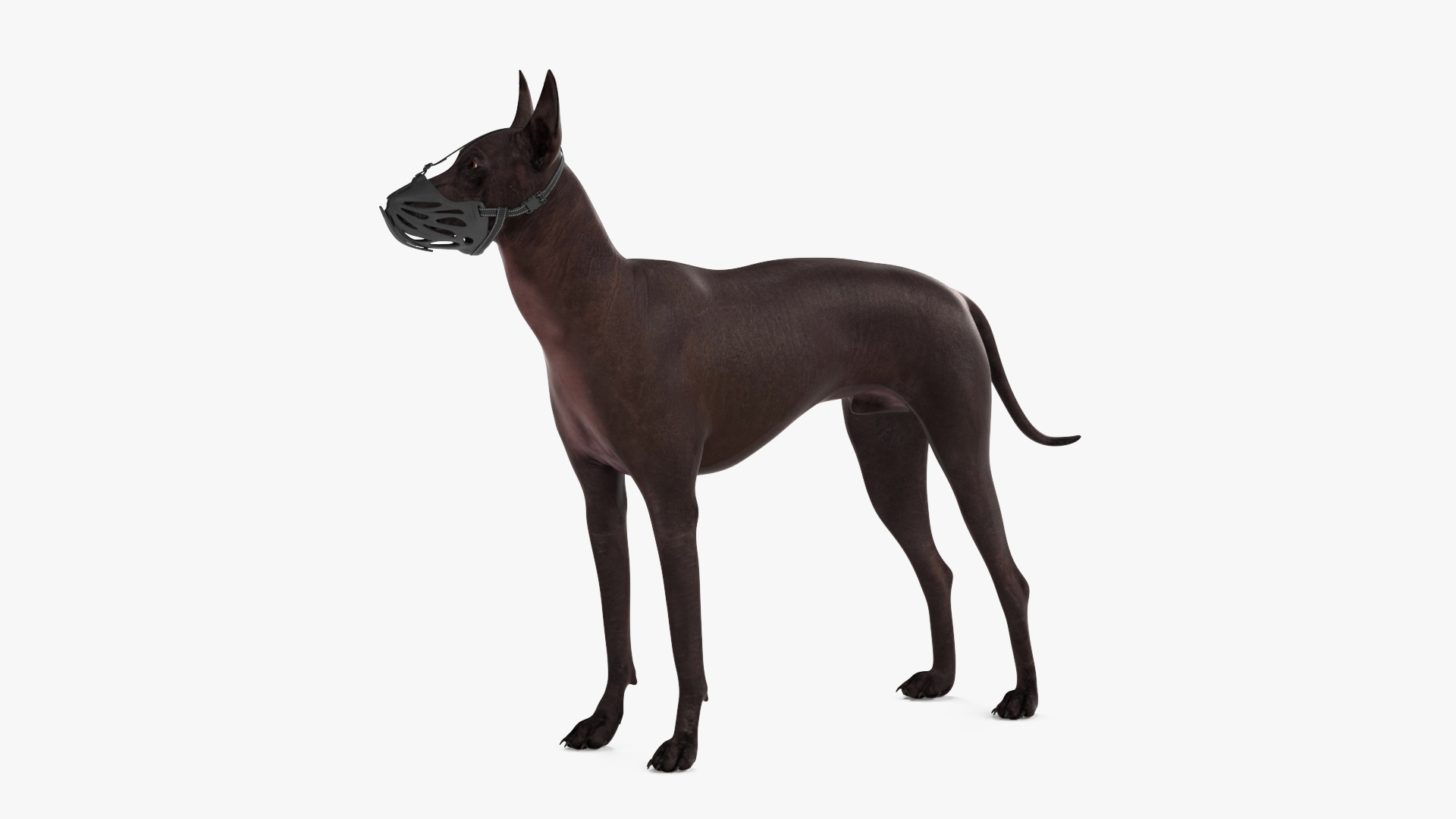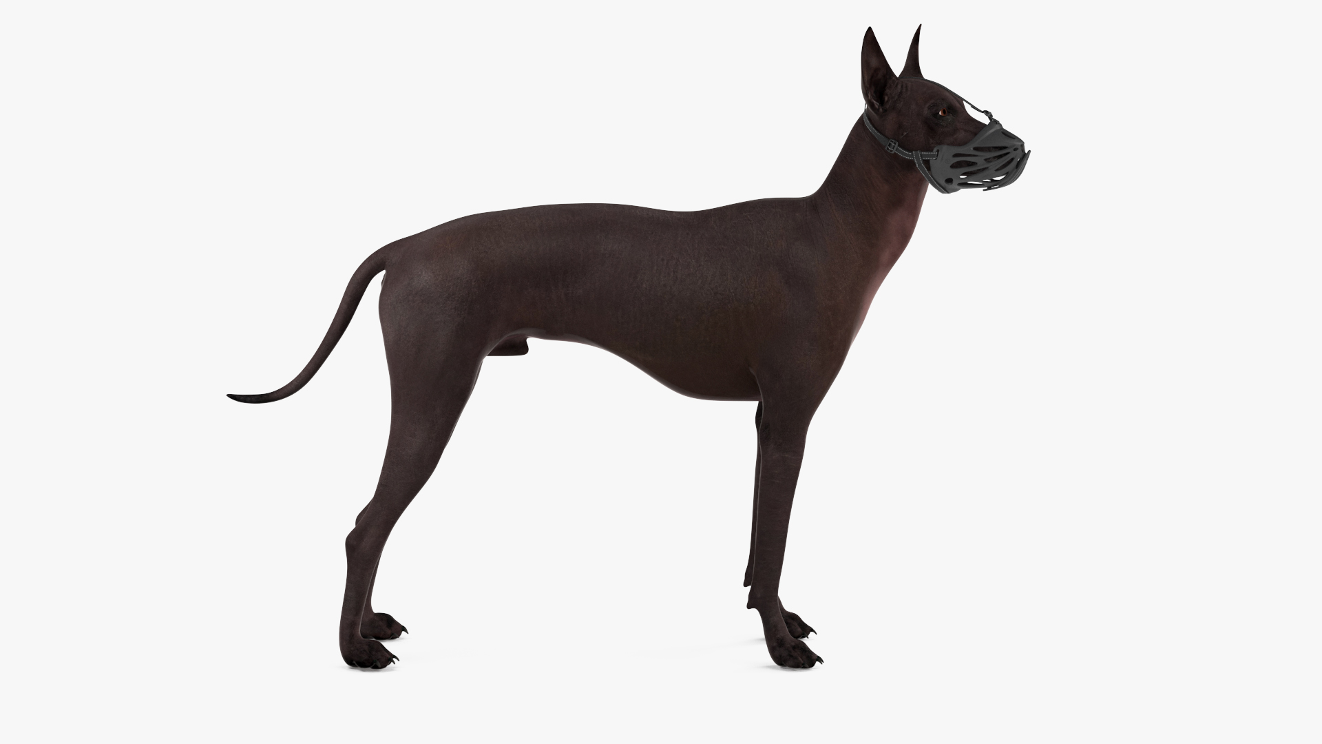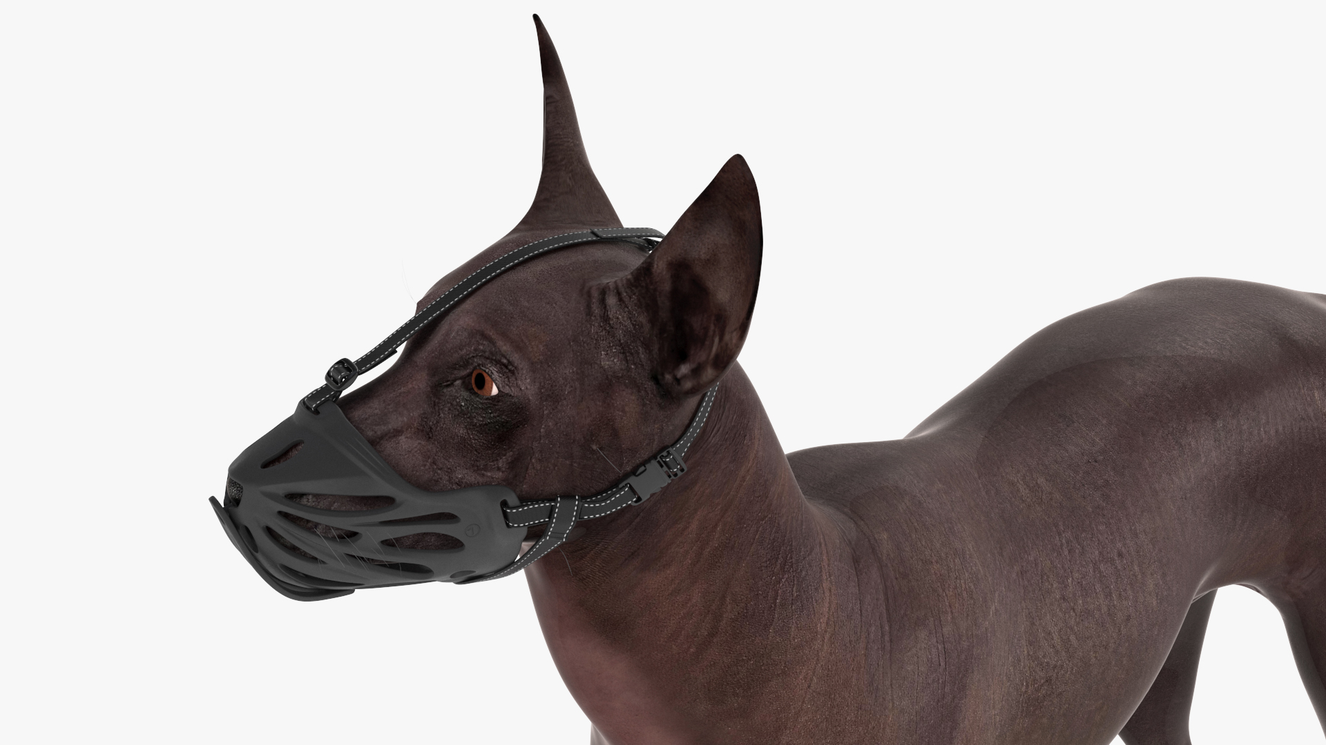 Xoloitzcuintli Rare Breed Mexican Dog with Muzzle is a three-dimensional model of dog pet with a dog muzzle that is a pet accessory designed to cover a dog's snout and prevent biting, barking, or chewing.