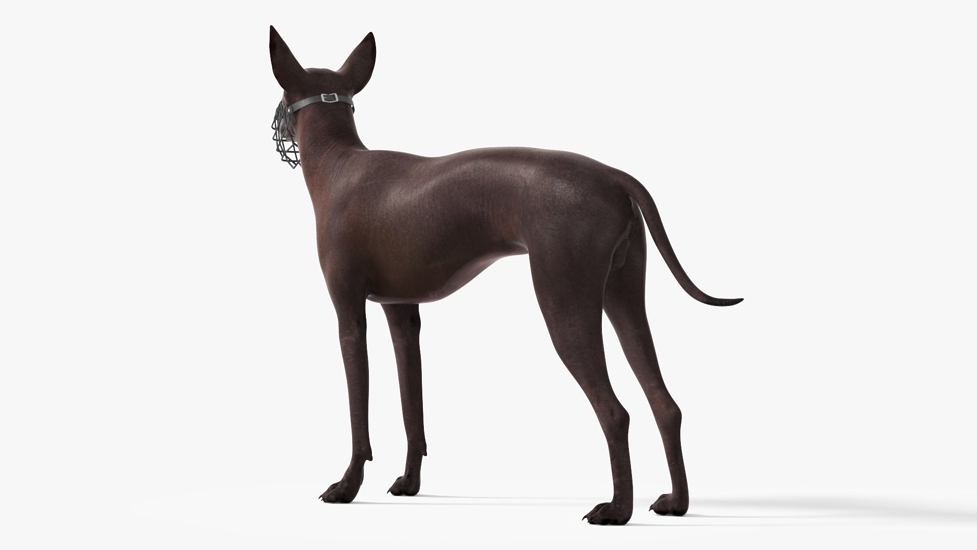 Xoloitzcuintli Rare Breed Mexican Dog with Muzzle is a three-dimensional model of dog pet with a dog muzzle that is a pet accessory designed to cover a dog's snout and prevent biting, barking, or chewing.