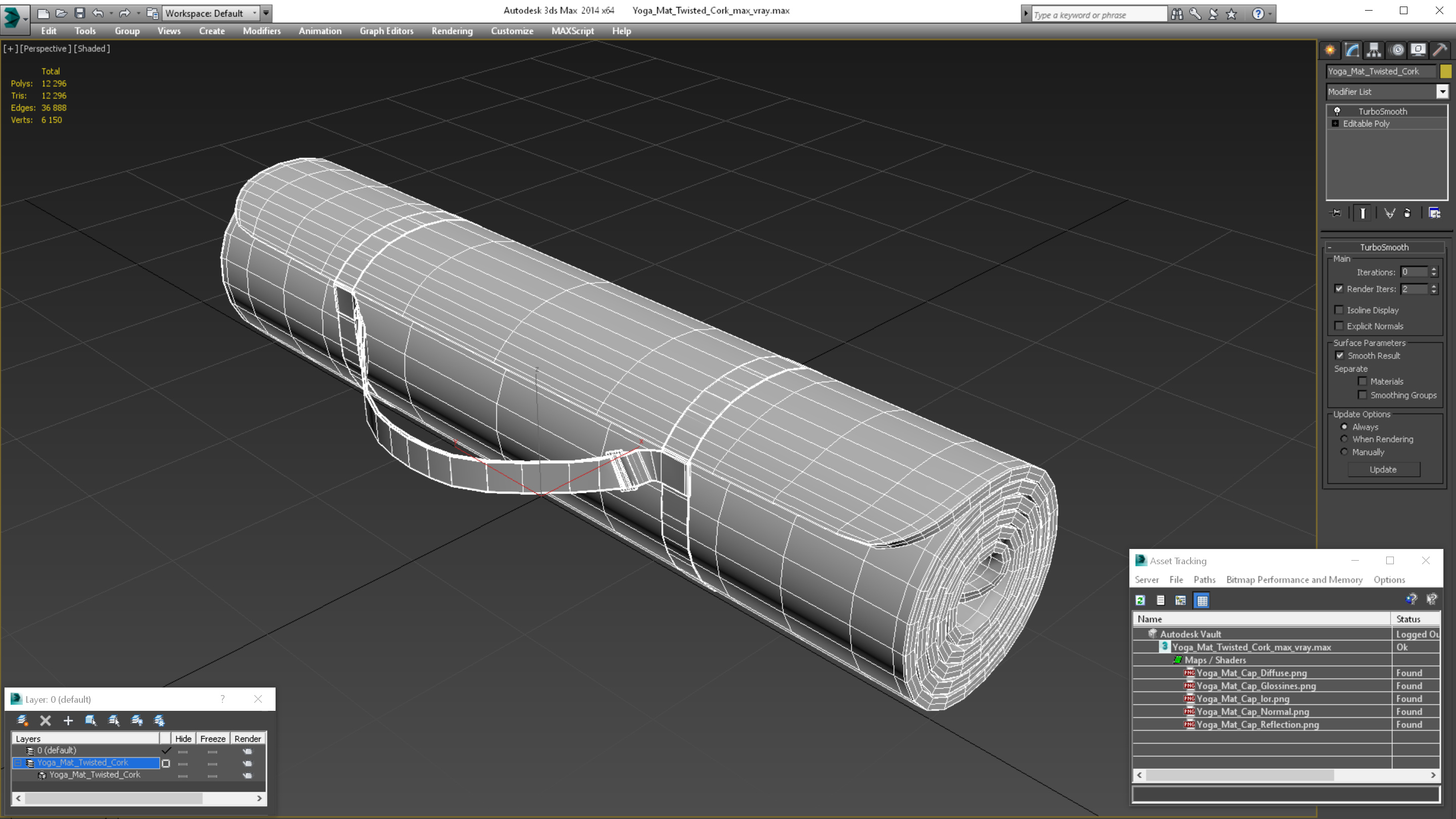 Yoga Mat Twisted Cork is a high quality, photo real 3d model that will enhance detail and realism to any of your rendering projects. The model has a fully textured, detailed design that allows for close-up renders, and was originally modeled in 3ds Max 2020 and rendered with V-Ray. Renders have no postprocessing!
